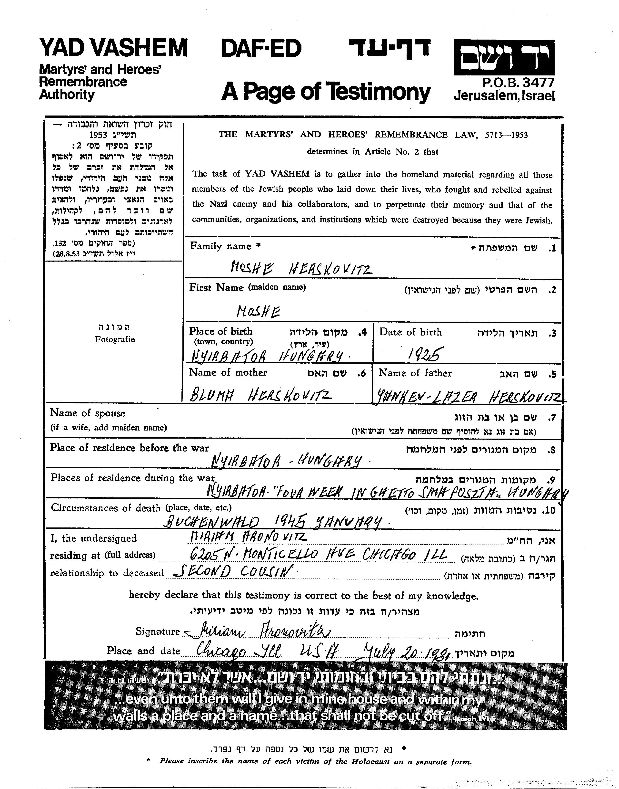 Хершковиц Моше 1925 Ньирбатор, Венгрия Лист свидетельских показаний