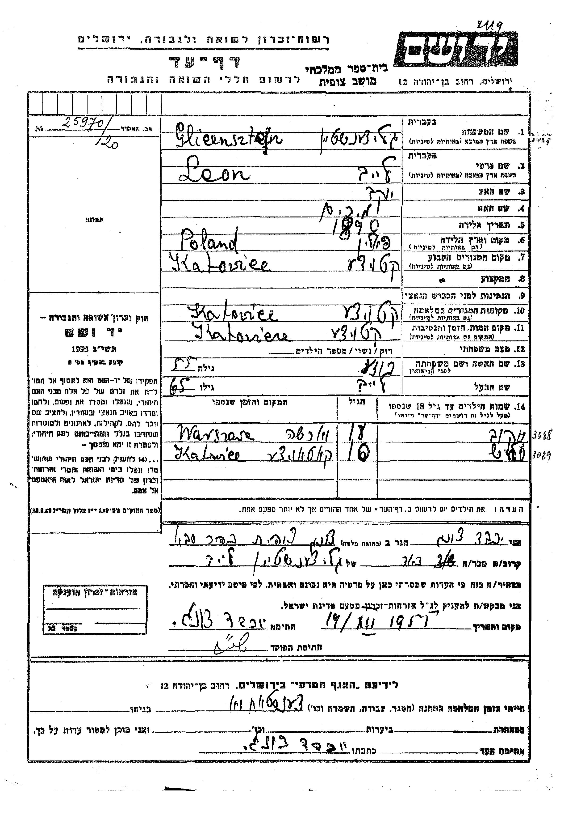 Глиценштейн Слуша Катовице, Польша Лист свидетельских показаний