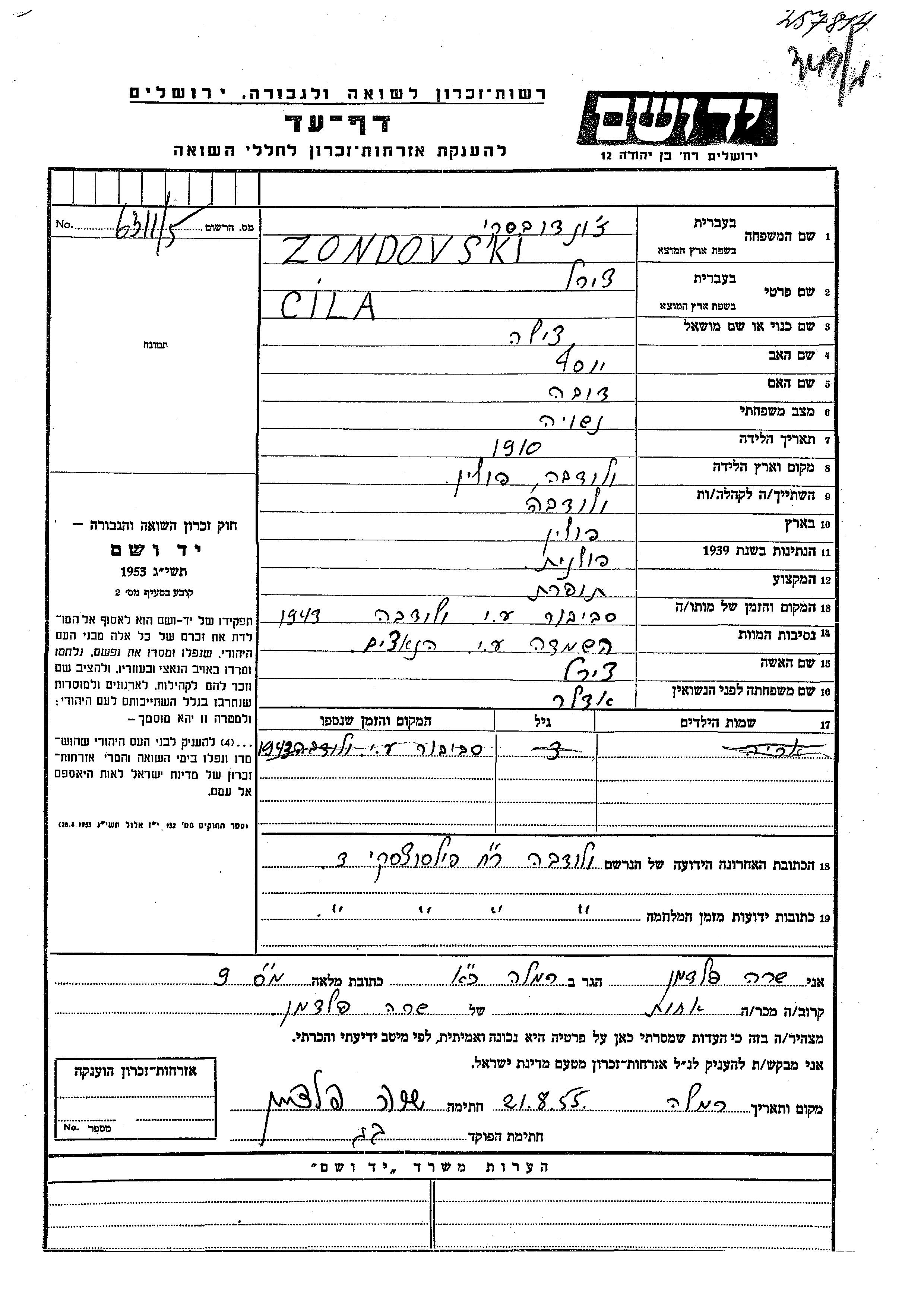 Яд Вашем - Листы свидетельских показаний Мемориального фонда