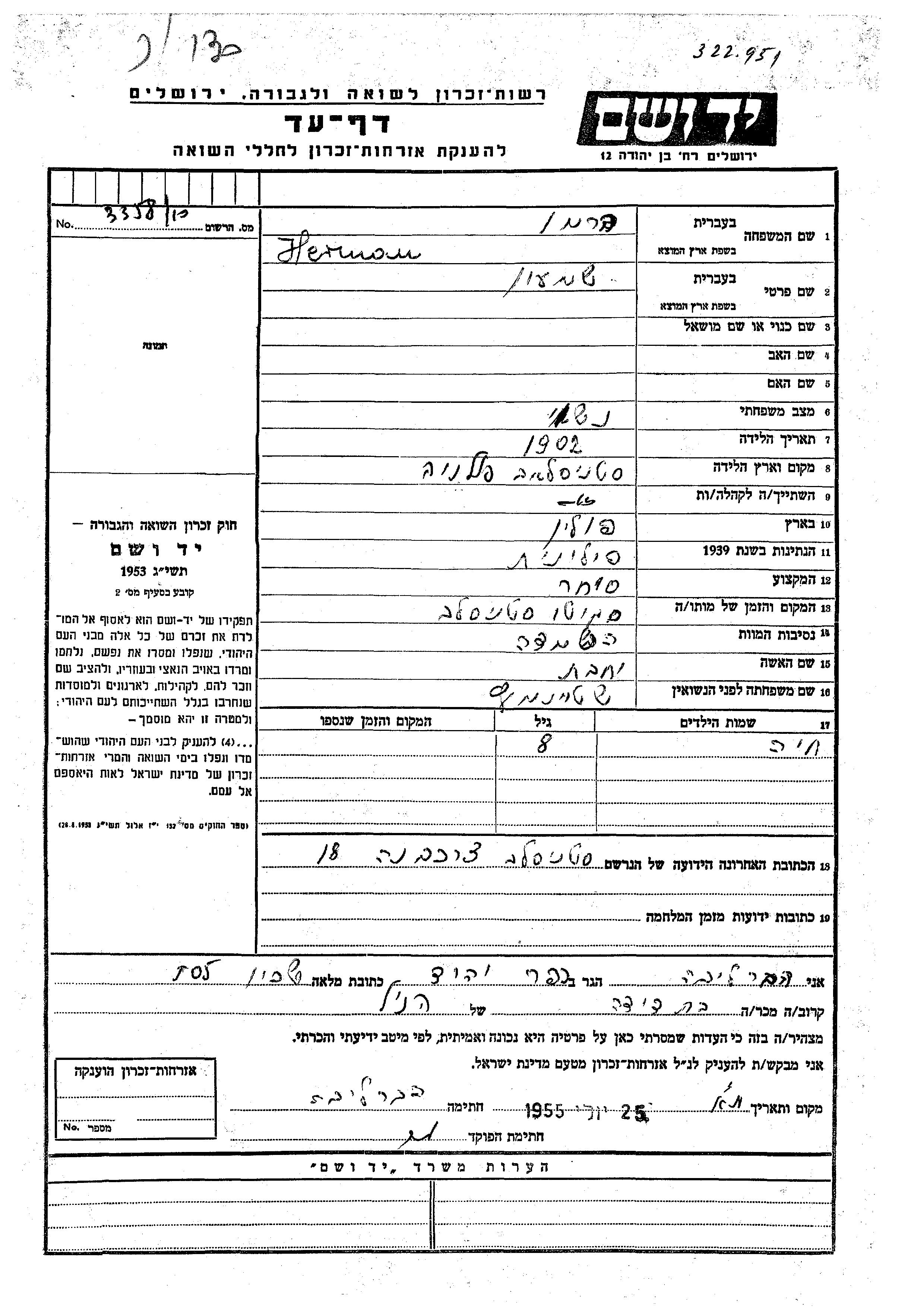 Хая Херман Шимон Йохевед девичья фамилия Штейнмец. Ребенок. Место жительства до войны: Станислав, Польша. Место во время войны: Станислав, Польша.