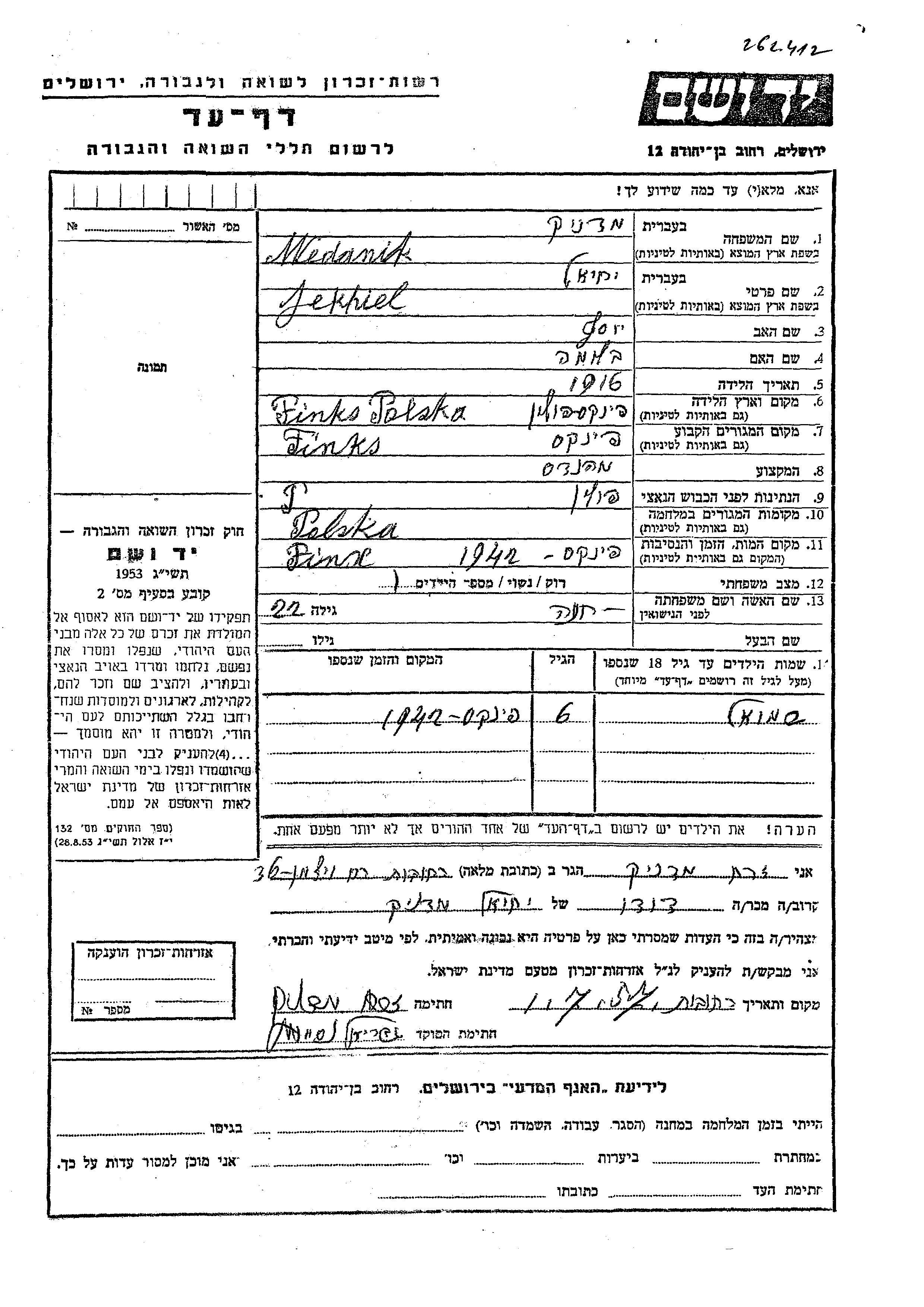Меданик Медник Шмуэль Пинск, Польша Лист свидетельских показаний