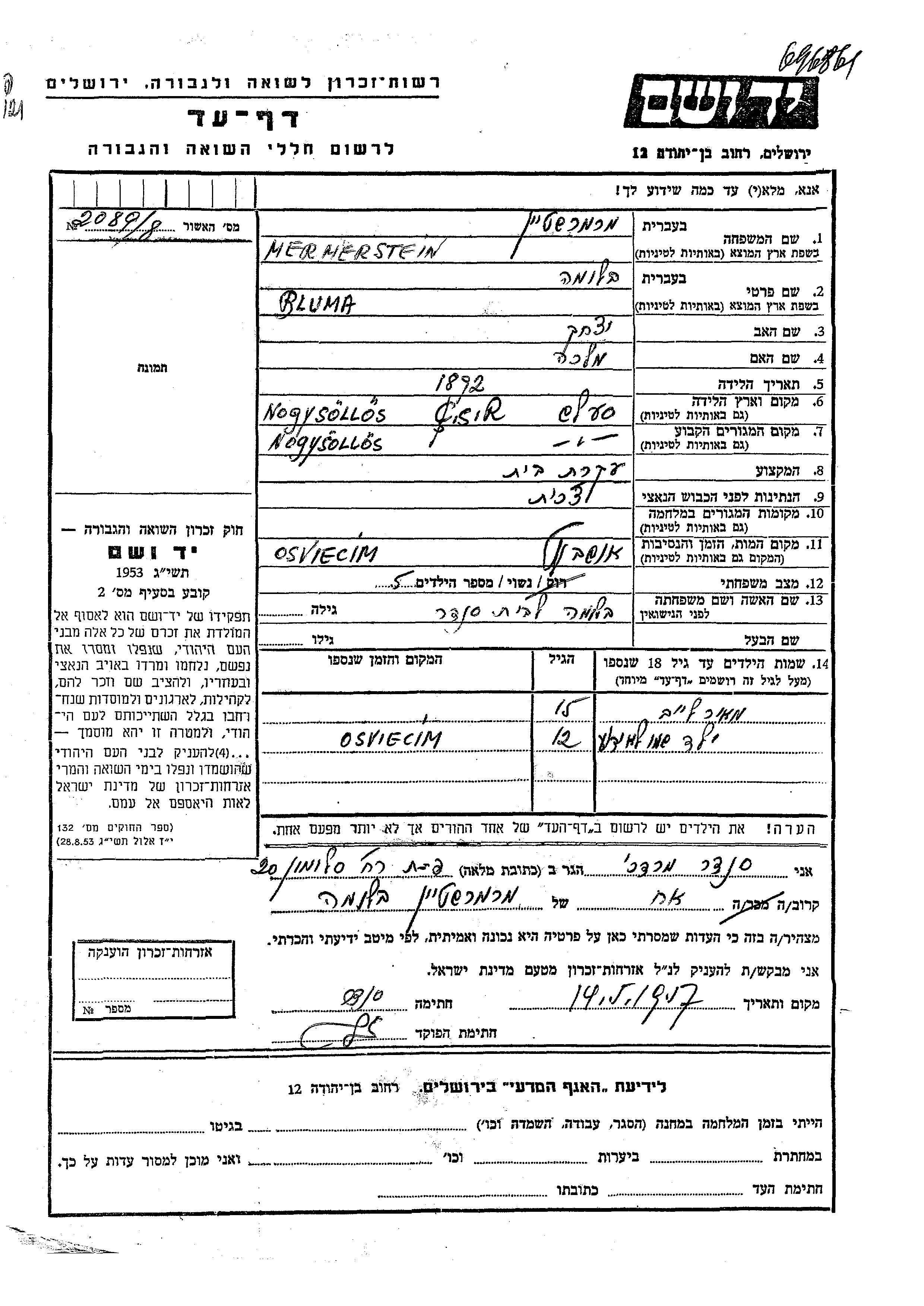 Яд Вашем - Листы свидетельских показаний Мемориального фонда
