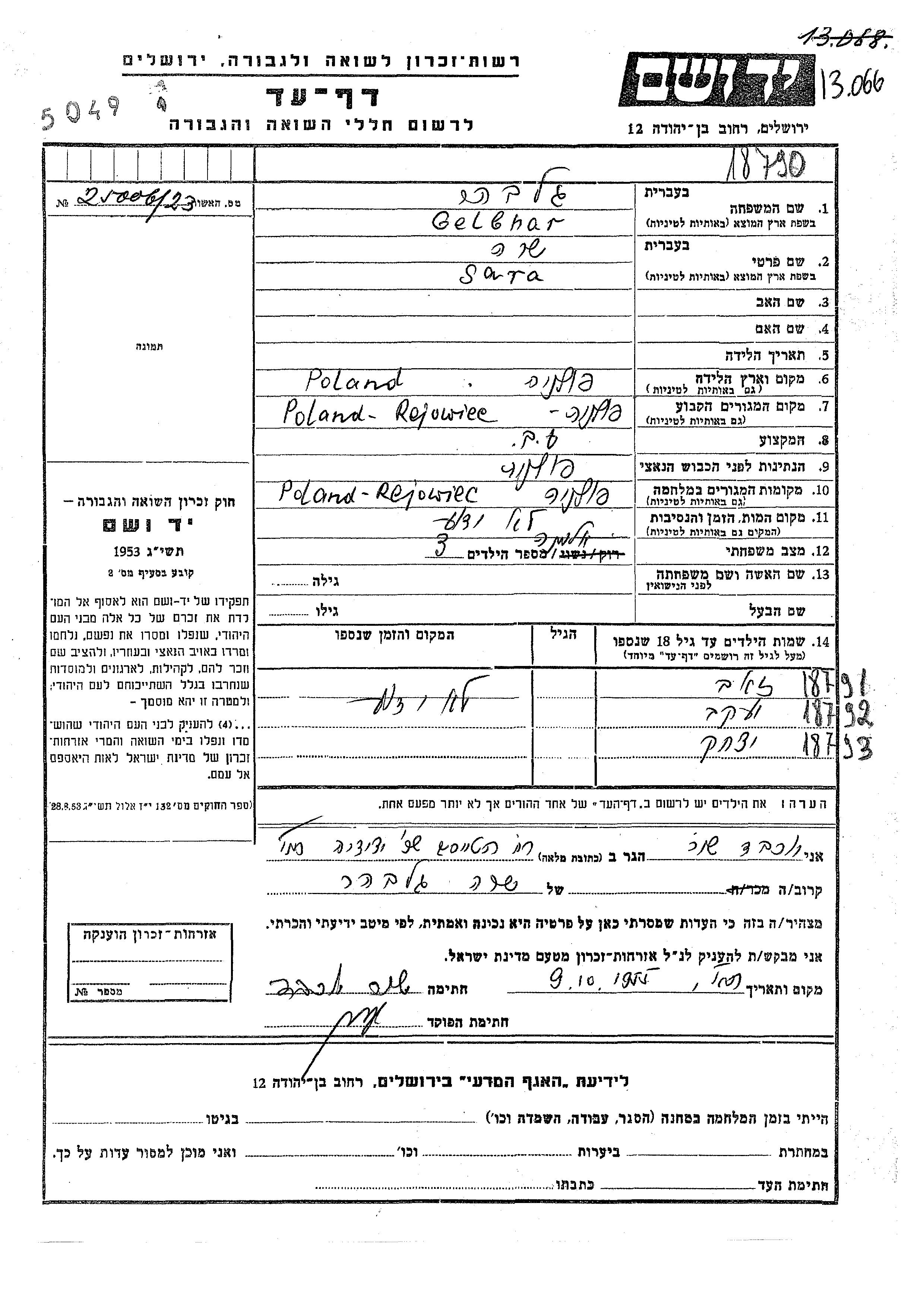 Гельбхар Яков Реёвец, Польша Лист свидетельских показаний