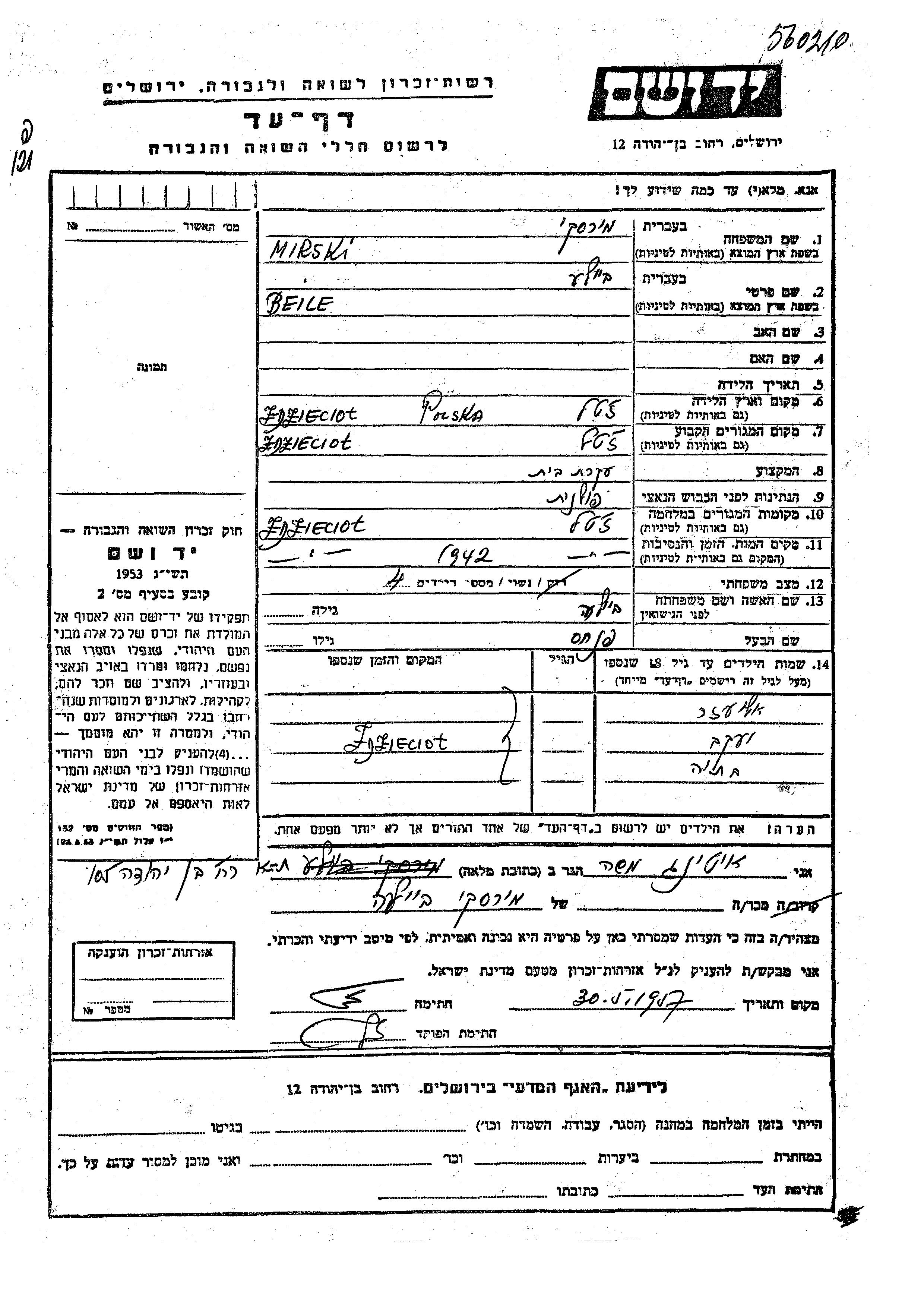 Мирский Яков Здзенцёл, Польша Лист свидетельских показаний