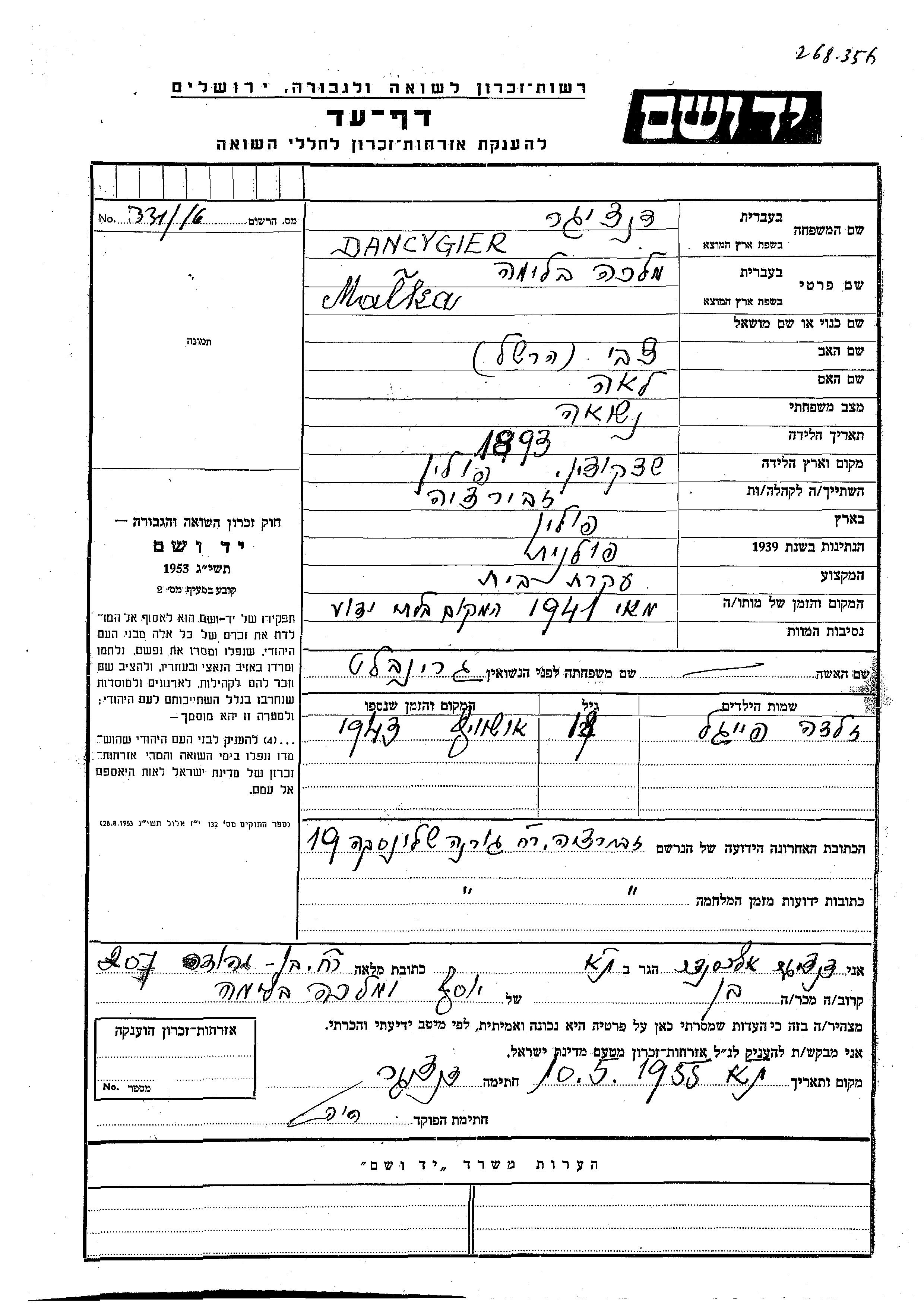Данцигер Зельда Файгель Польша Лист свидетельских показаний