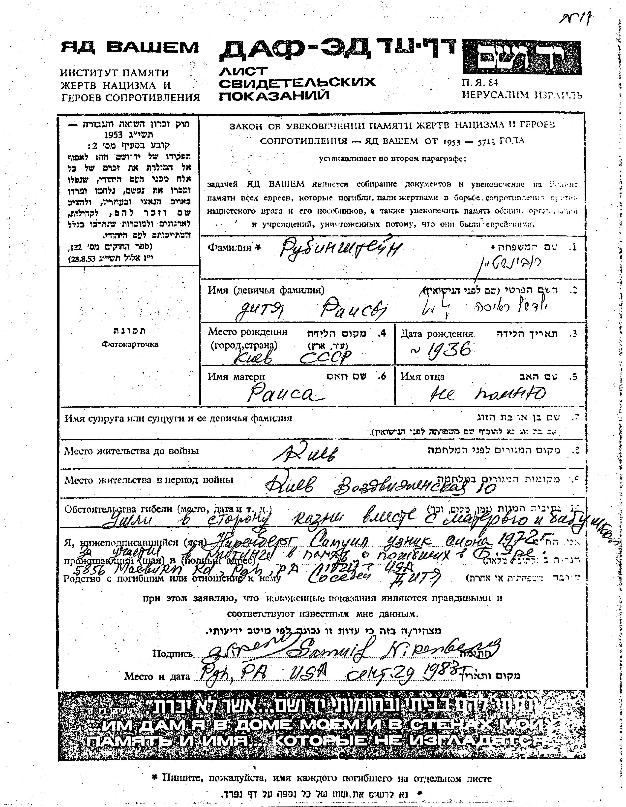 Рубенштейн Имя неизвестно 1936 Киев, Украина (СССР) Лист свидетельских показаний