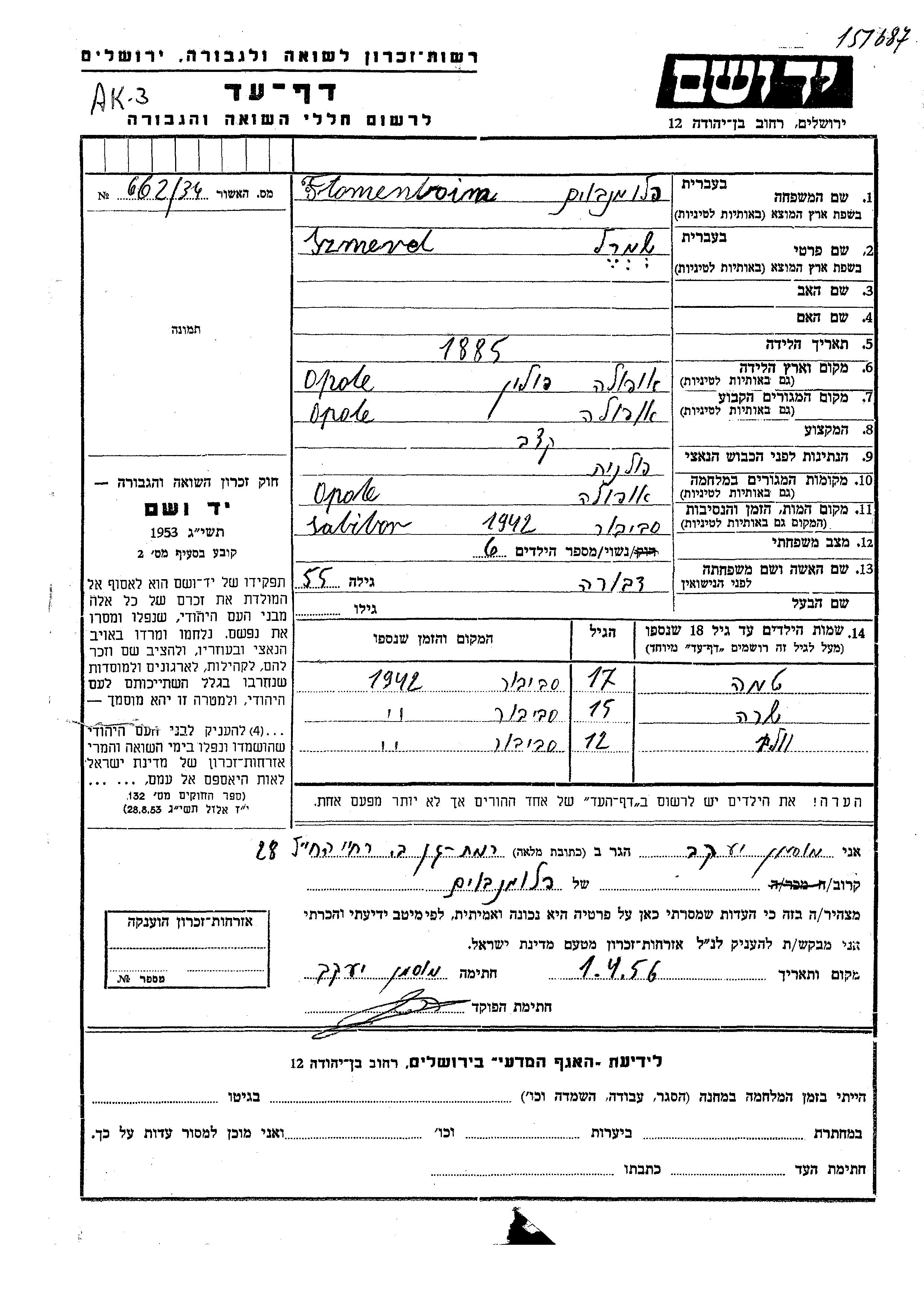 Фломенбойм Тема Ополе, Польша Лист свидетельских показаний