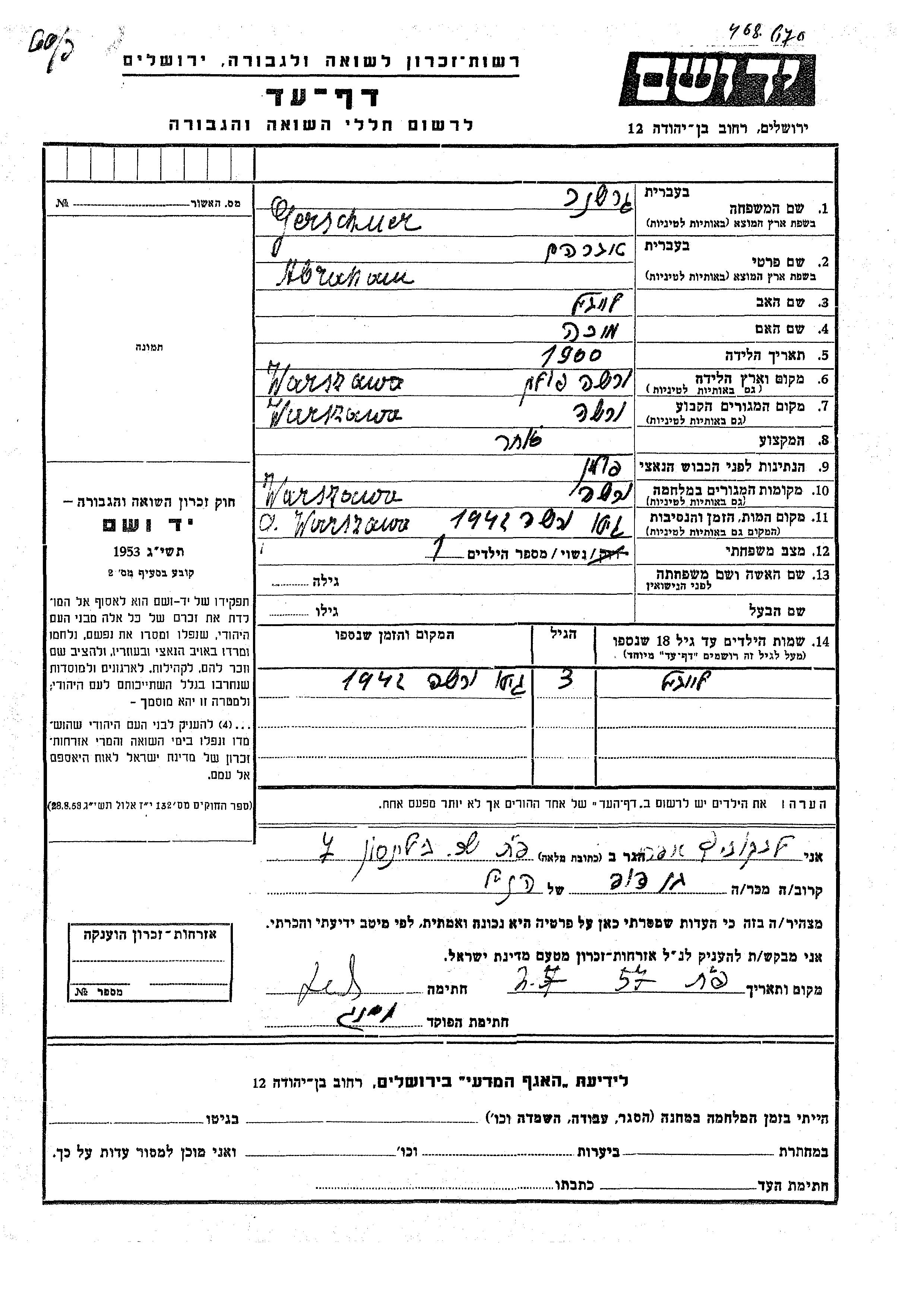 Гершнер Лейбел Варшава, Польша Лист свидетельских показаний