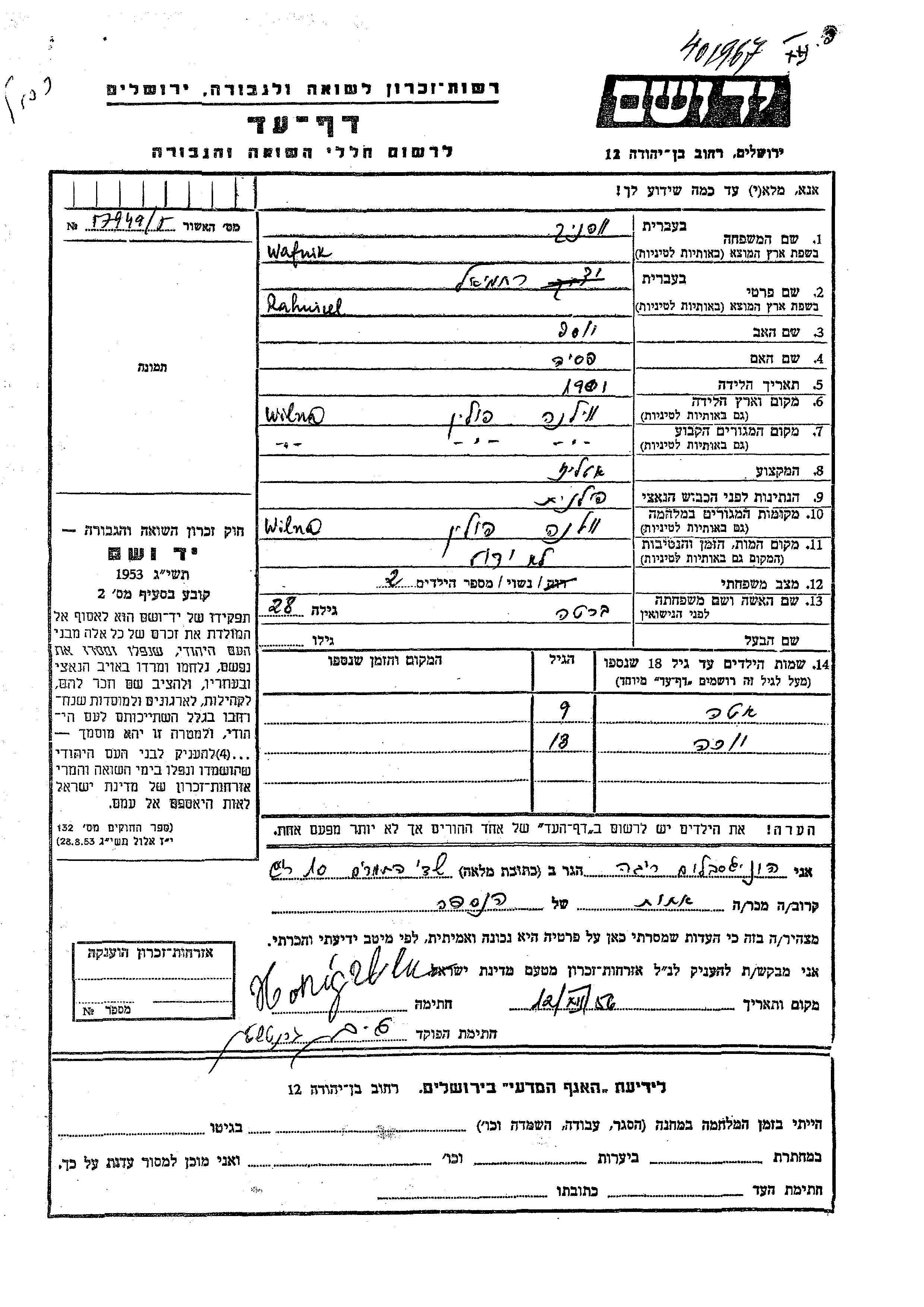 Вафник Эта Вильно, Польша Лист свидетельских показаний