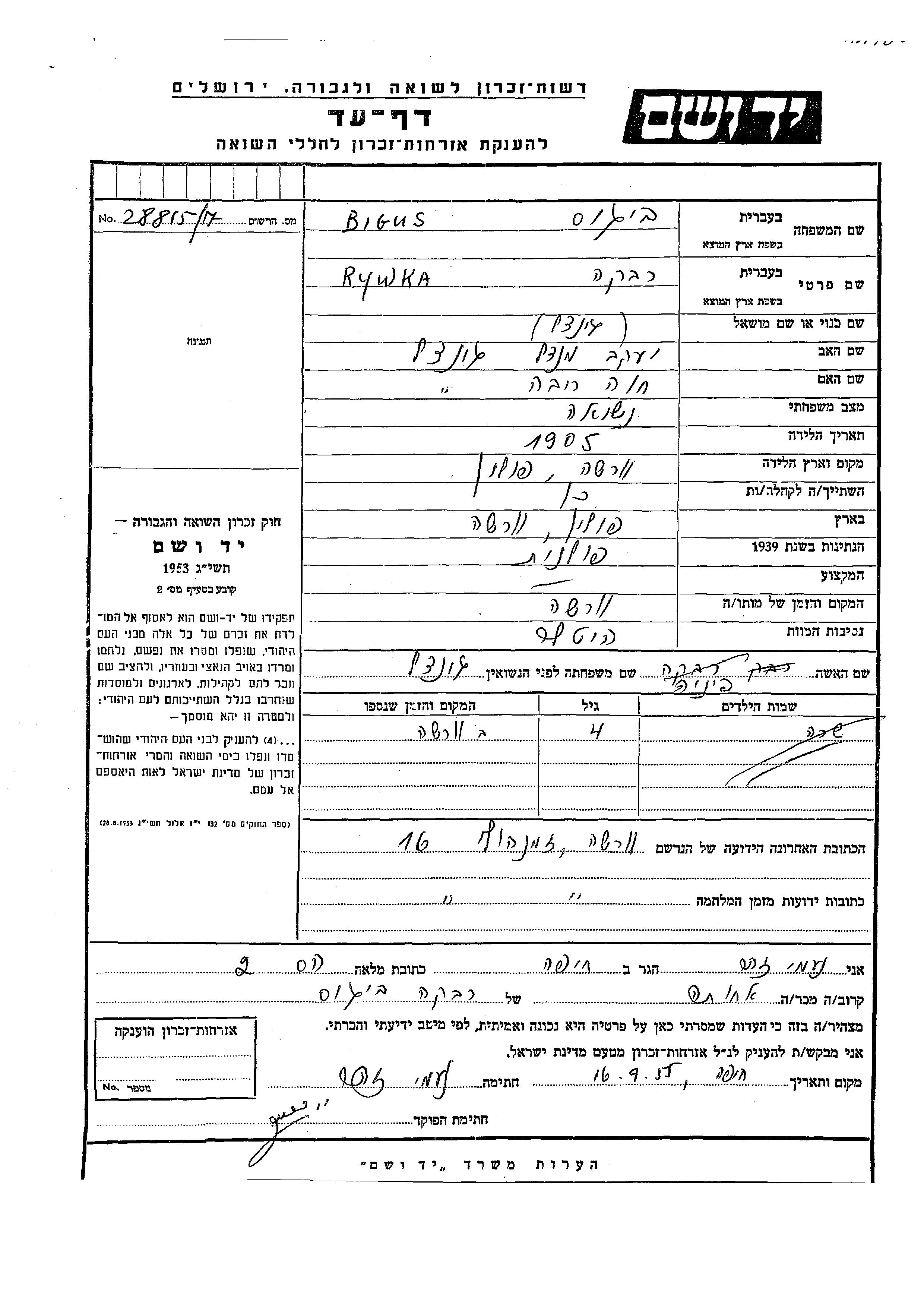 Бигус Сара Варшава, Польша Лист свидетельских показаний