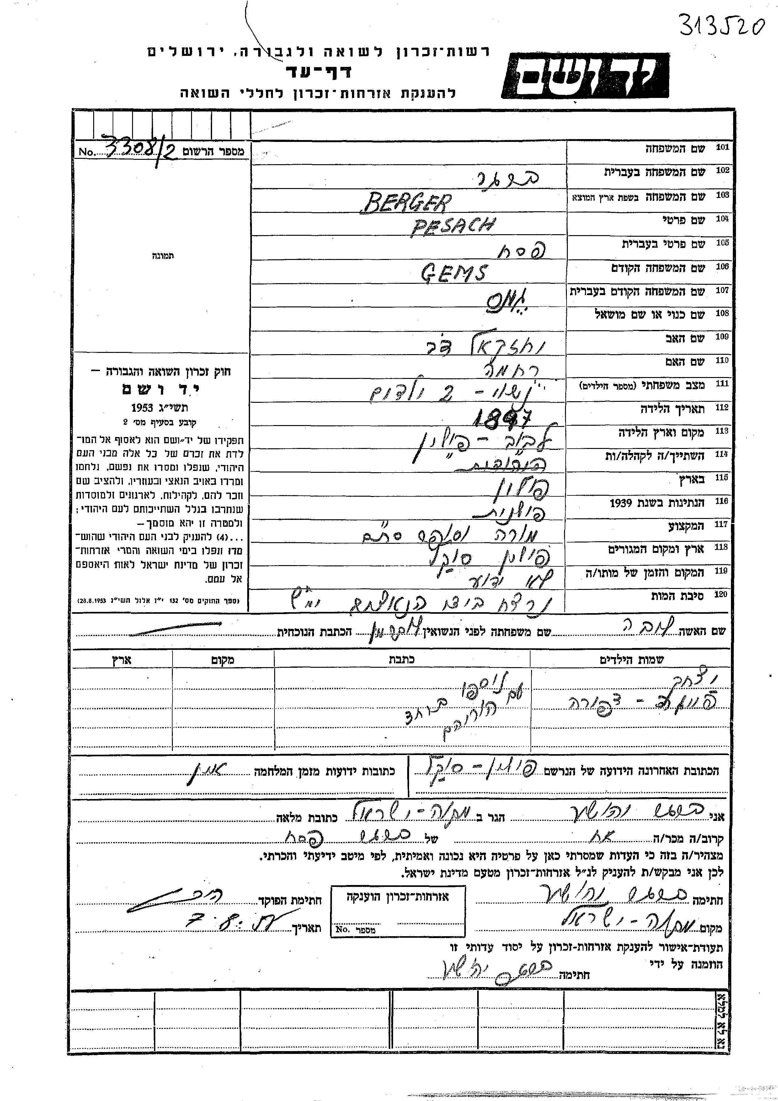 Бергер Фейга Ципора Львов, Польша Лист свидетельских показаний