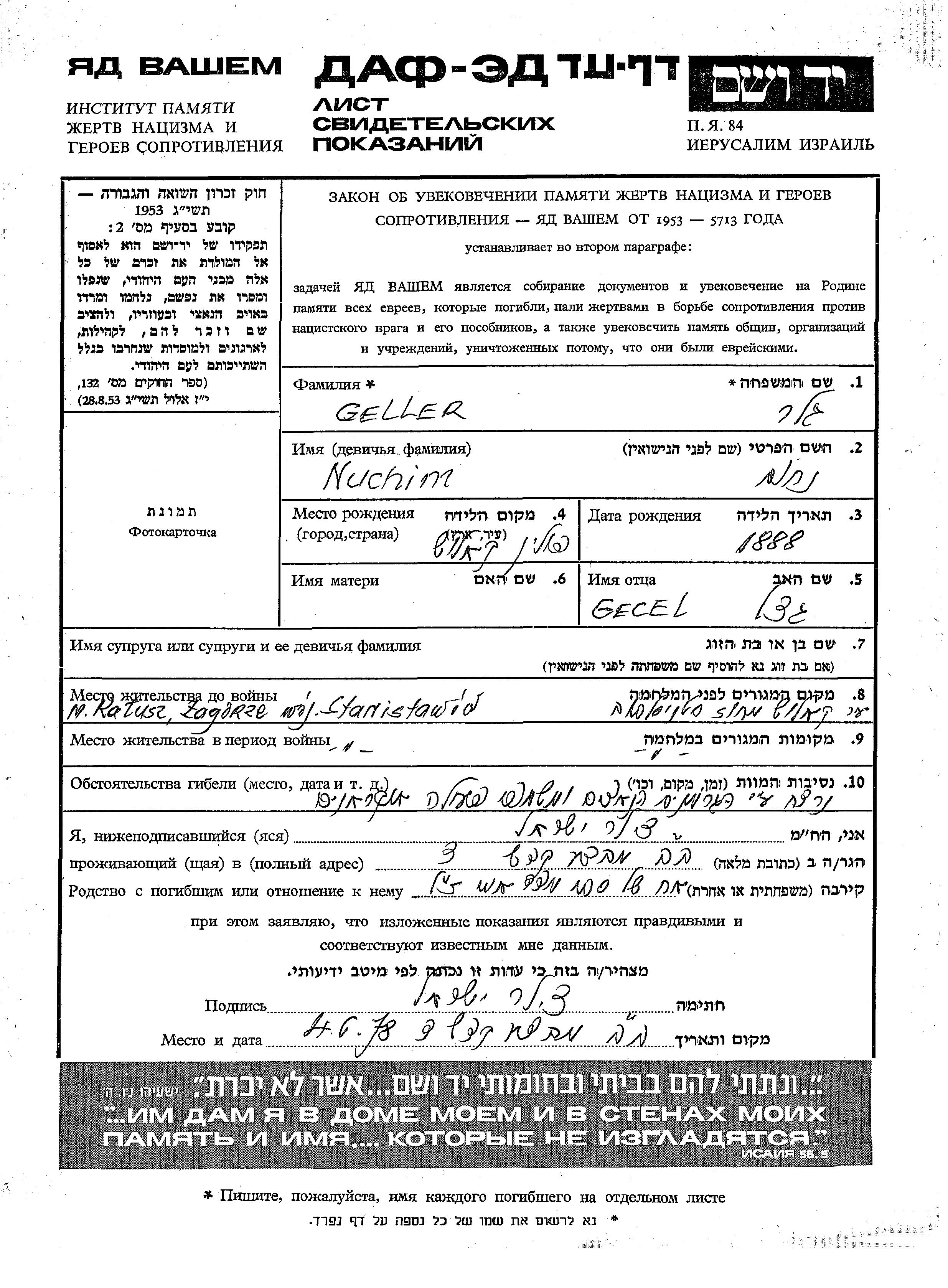 Нухим Геллер, место рождения: Калуш, Польша. Отец: Гецель Гедаль. Место жительства до войны: Калуш, Польша. Место во время войны: Калуш, Польша.