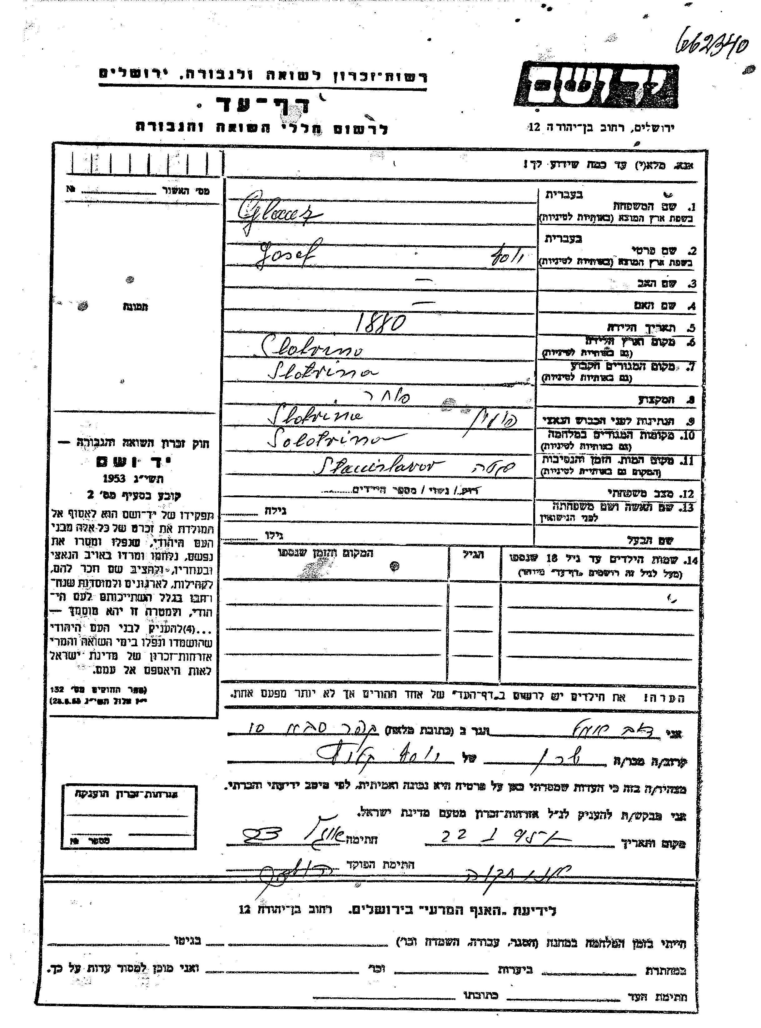 Глацер Иосеф 1880 Солотвин, Польша Лист свидетельских показаний