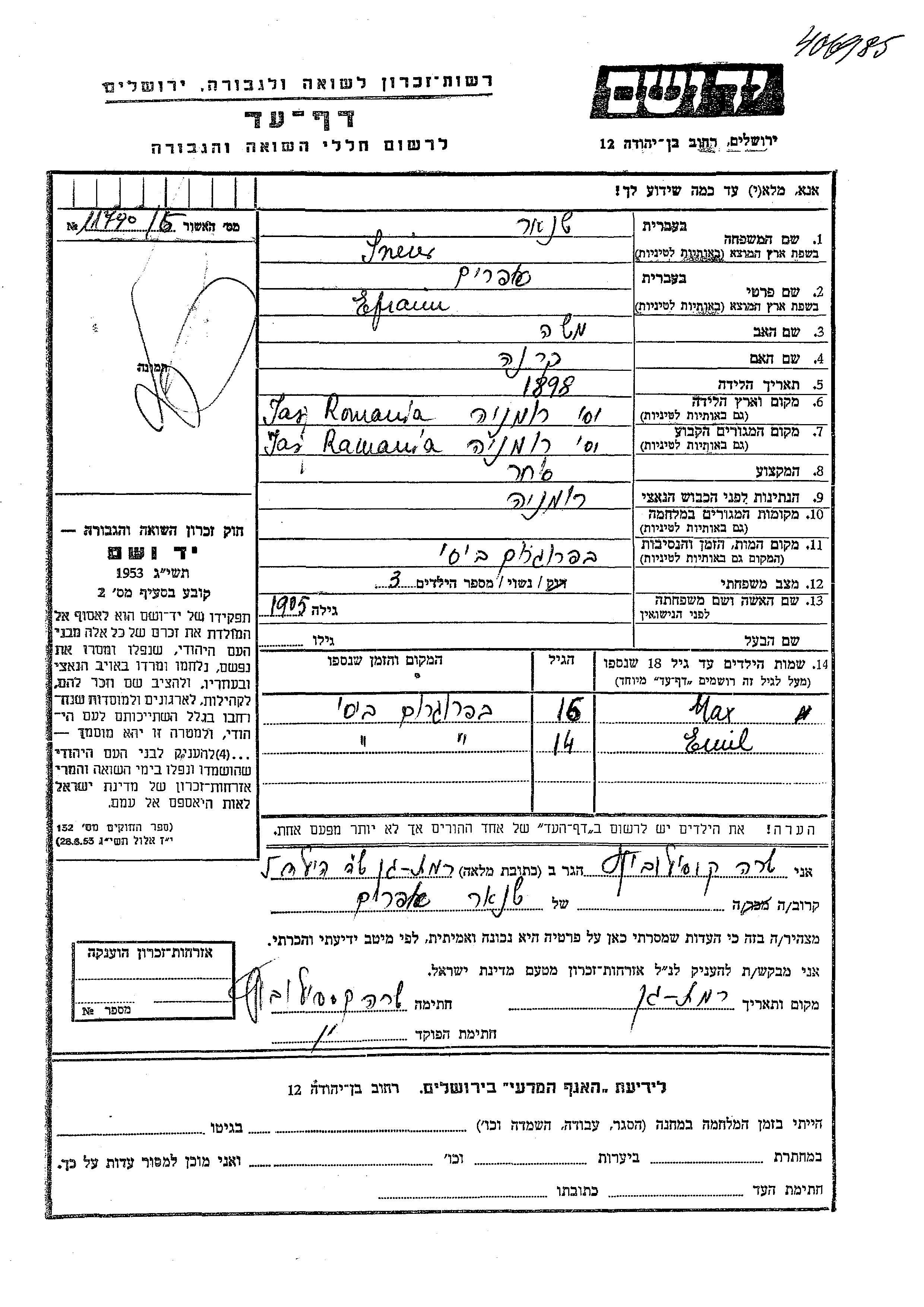 Снеор Шнер Эмиль Яссы, Румыния Лист свидетельских показаний