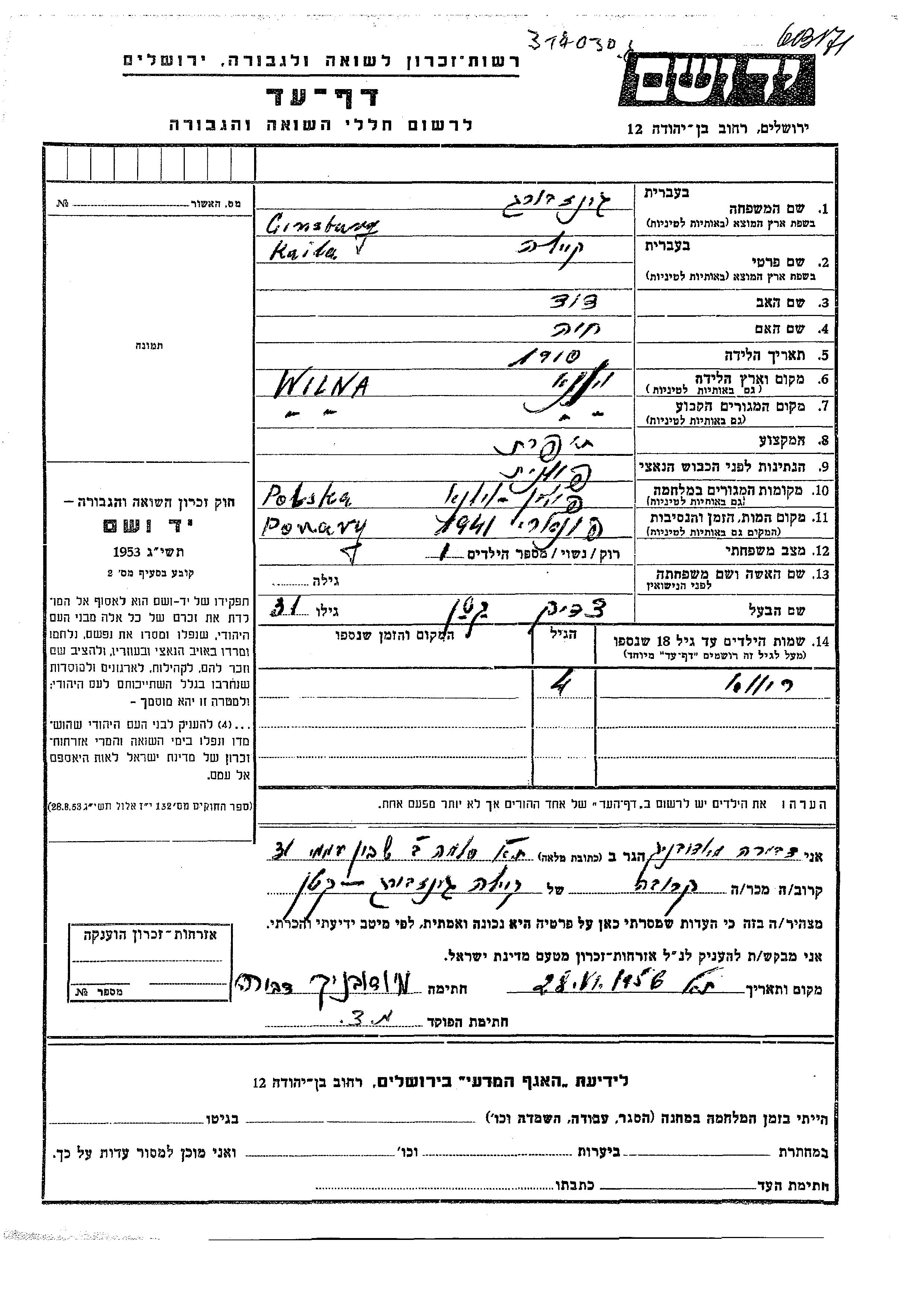 Гинзбург Рива Вильна, Польша Лист свидетельских показаний