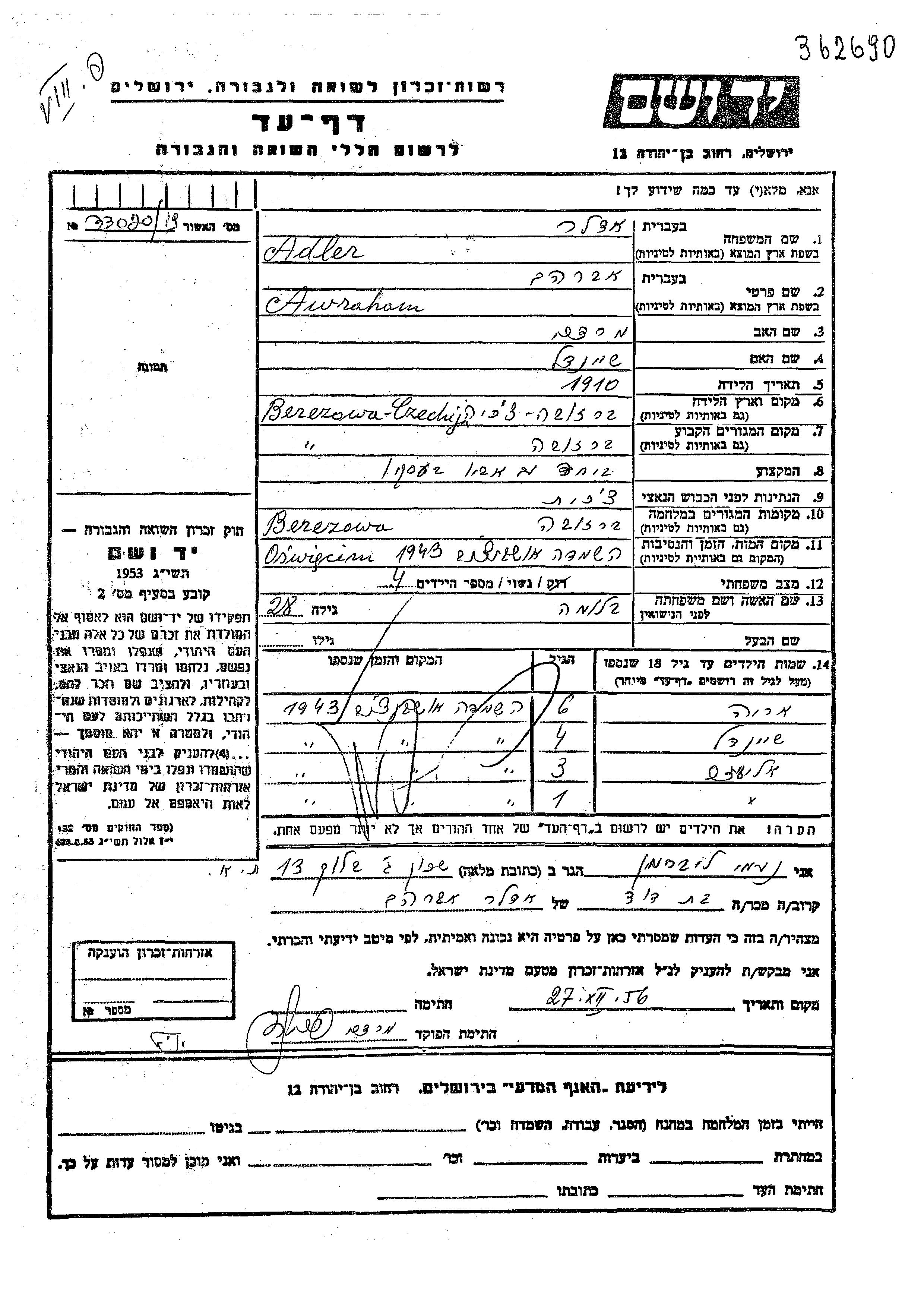Адлер Элиэзер Березово, Чехословакия Лист свидетельских показаний