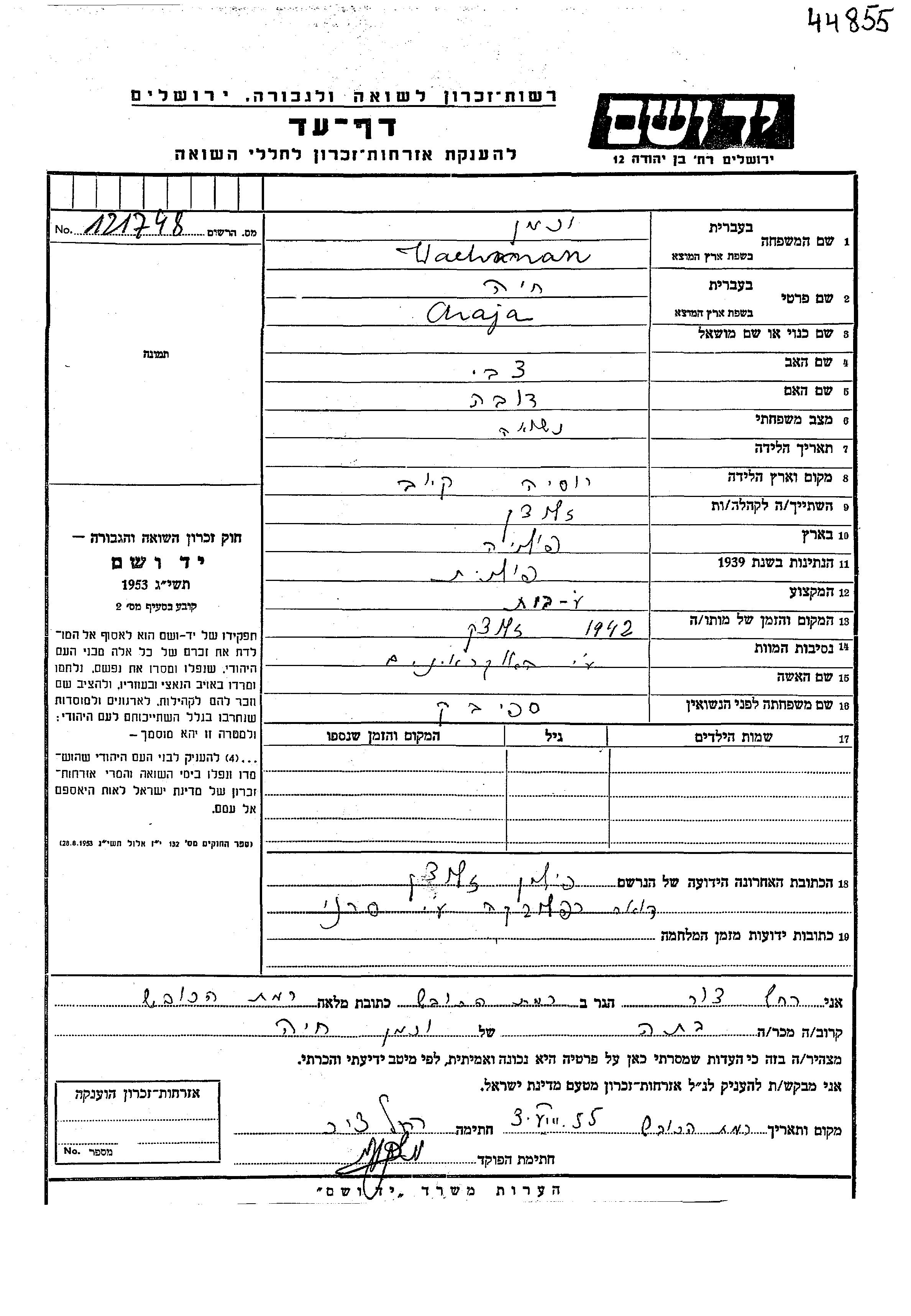 Хая Вахман, девичья фамилия Спивак, место рождения: Киев, Украина (СССР). Отец: Цви, mать:Доба. Домохозяйка. Женат / замужем. Место жительства до войны: Желуцк, Польша. Место во время войны: Желуцк, Польша.