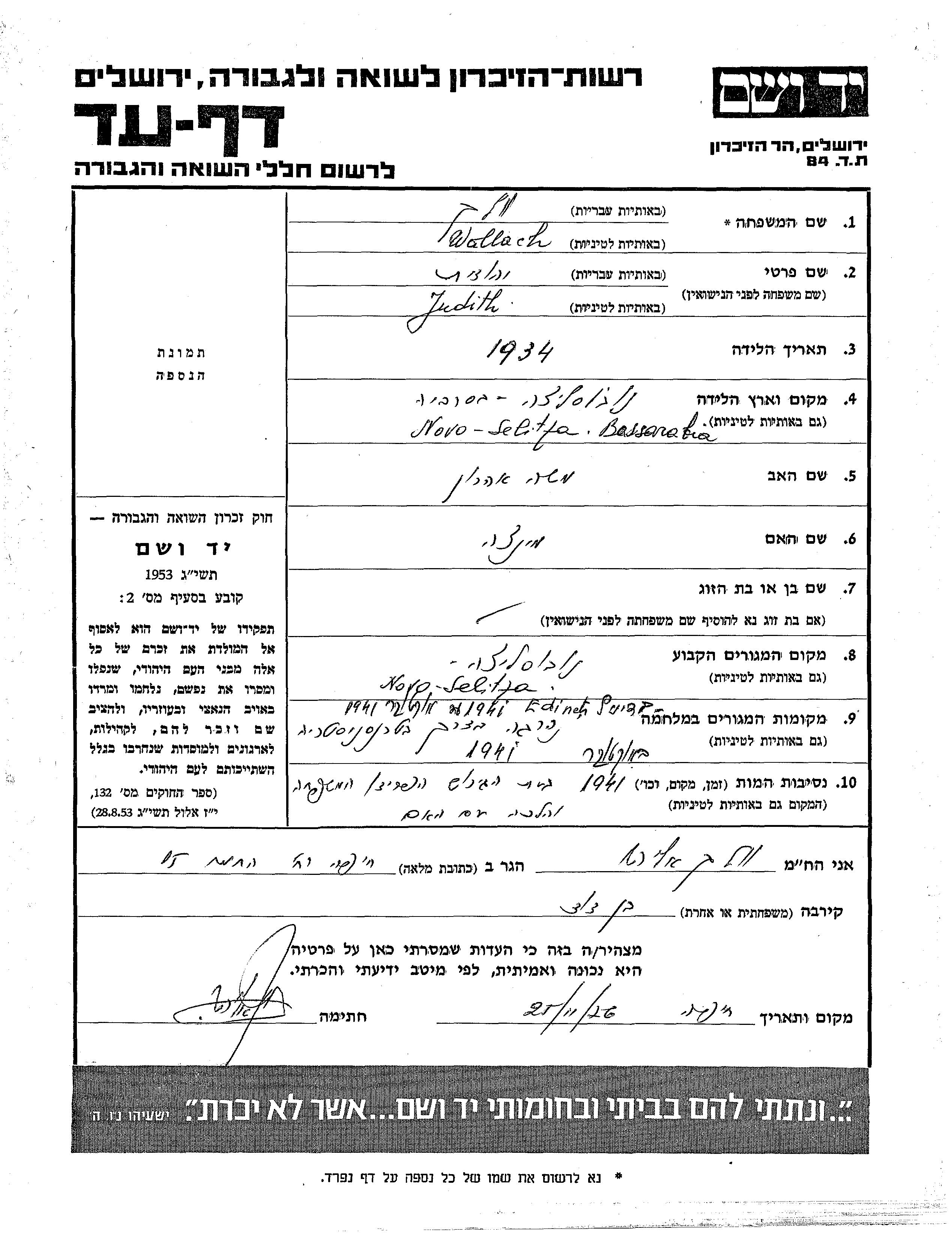 Валлах Волах Юдит 1934 Ново Селица, Румыния Лист свидетельских показаний