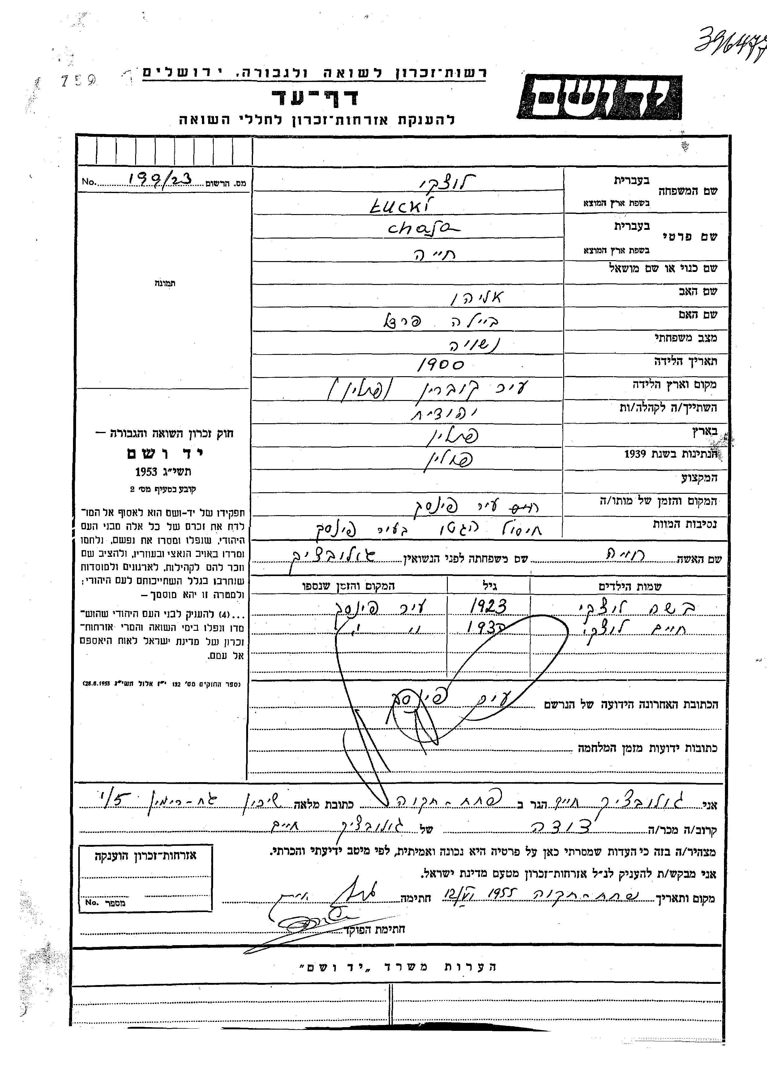 Луцки Хаим 1930 Пинск, Польша Лист свидетельских показаний
