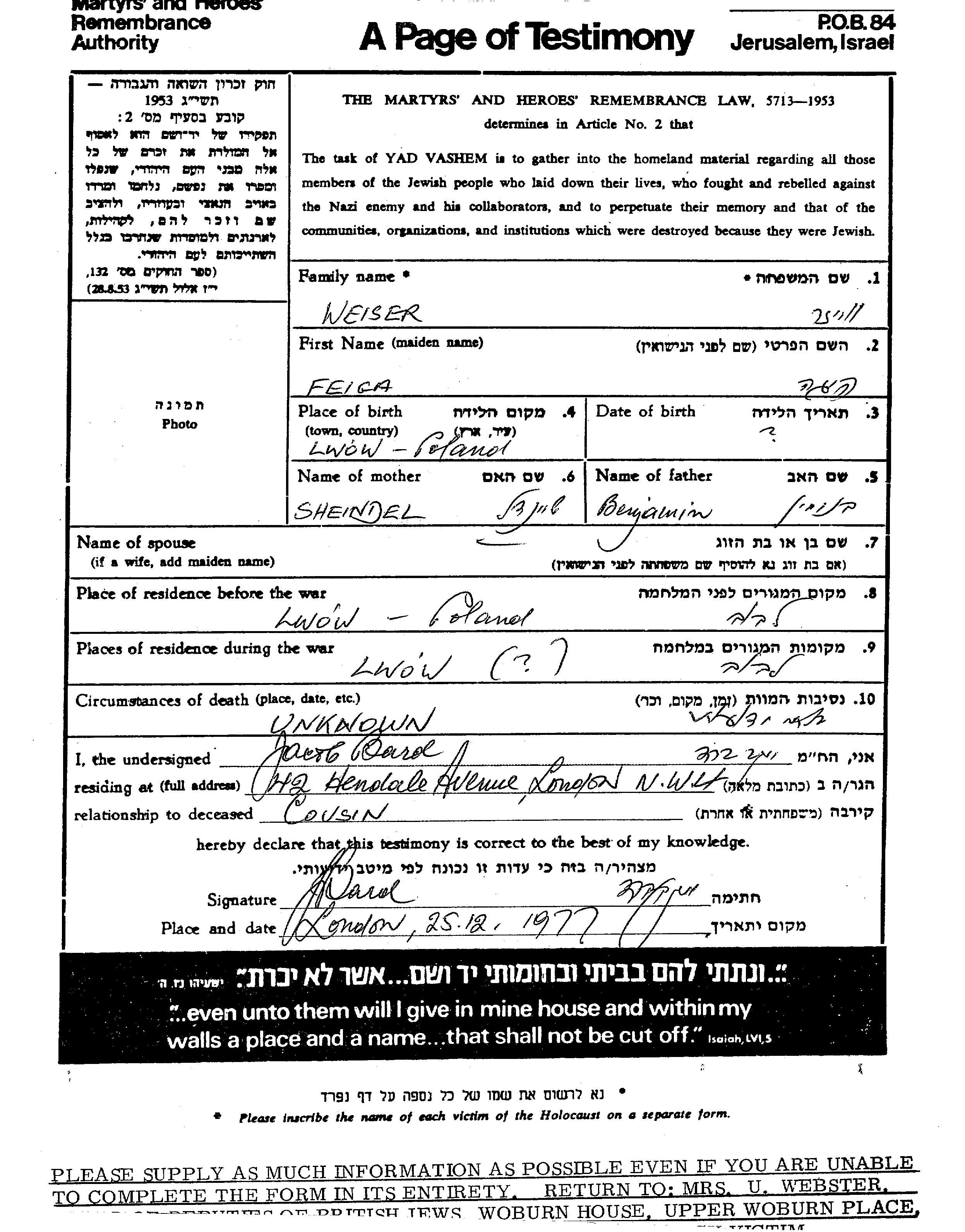 Фейга Вайзер, место рождения: Львов, Польша. Отец: Беньямин, mать:Шейндель. Место жительства до войны: Львов, Польша. Место во время войны: Львов, Польша.
