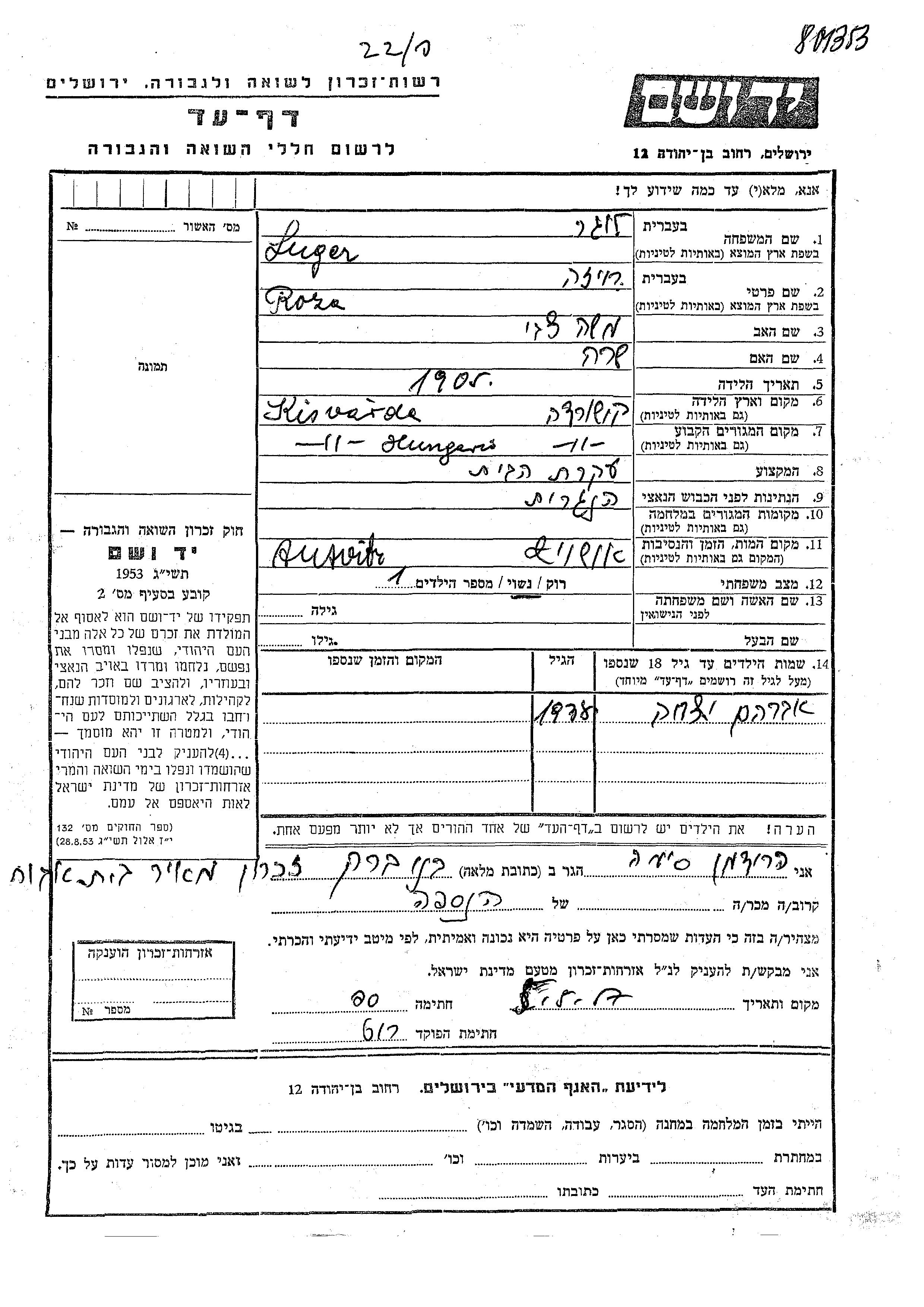 Лугер Авраам Ицхак 1938 Кишварда, Венгрия Лист свидетельских показаний