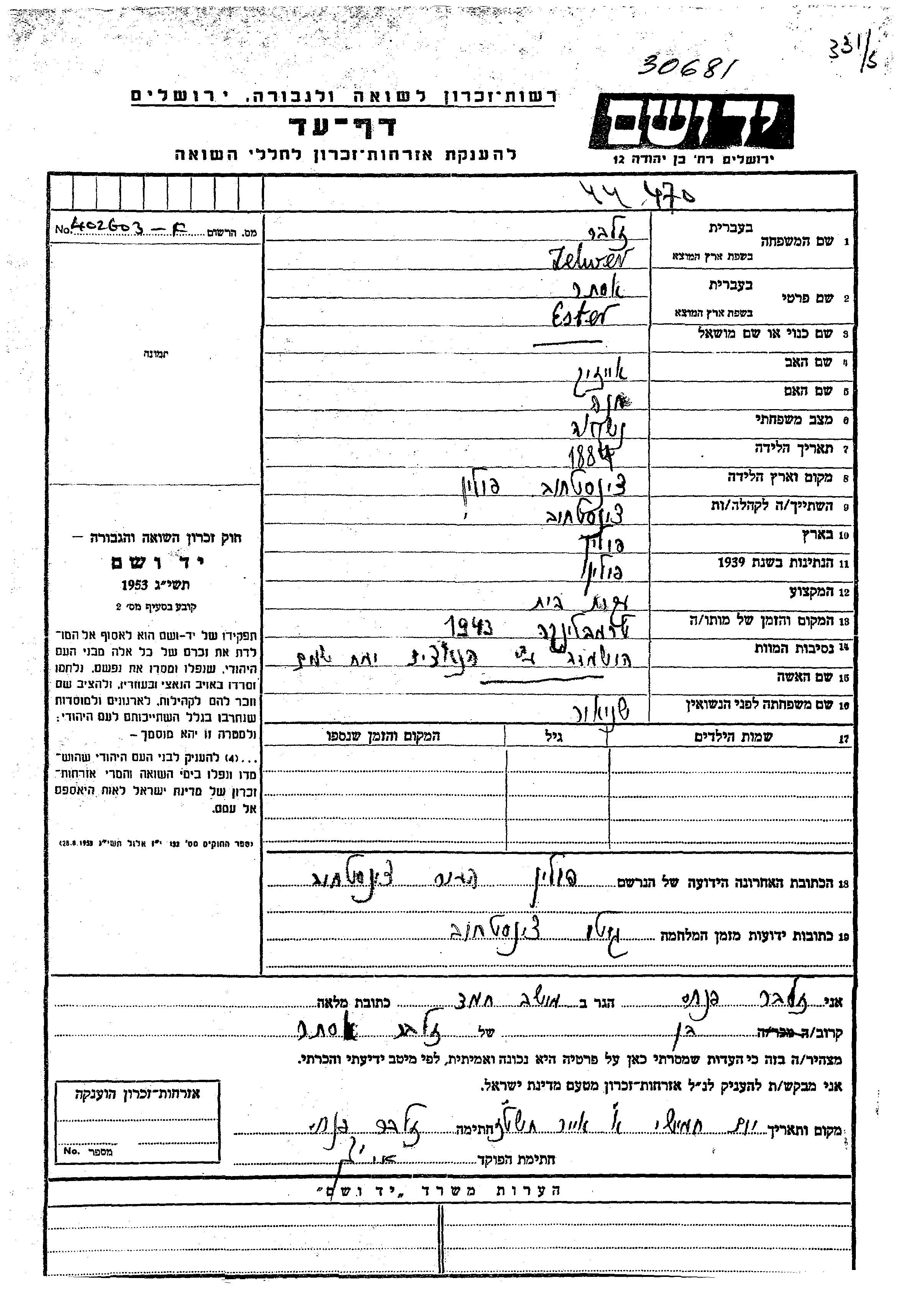 Эстер Зельвер, место рождения: Ченстохов, Польша. Отец: Айзик, mать:Хана. Домохозяйка. Женат / замужем. Место жительства до войны: Ченстохов, Польша. Место во время войны: Ченстохов, Польша.