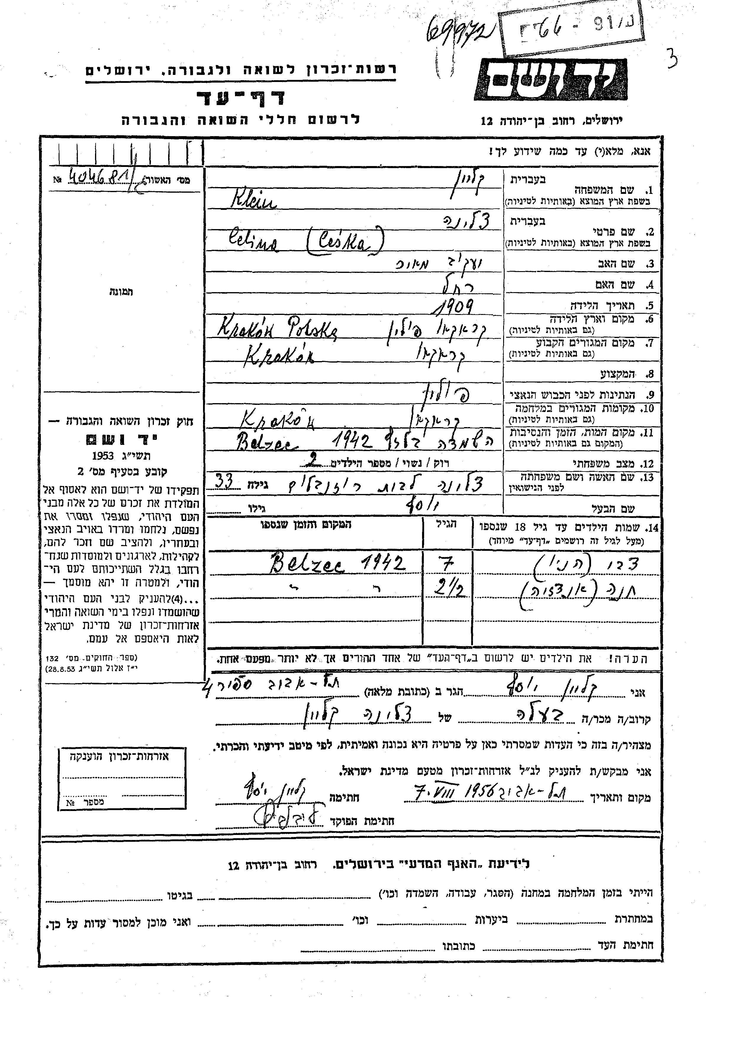 Хана Андзя Клейн Иосеф Цешка Целина девичья фамилия Розенблюм. Ребенок. Место жительства до войны: Краков, Польша. Место во время войны: Краков, Польша.