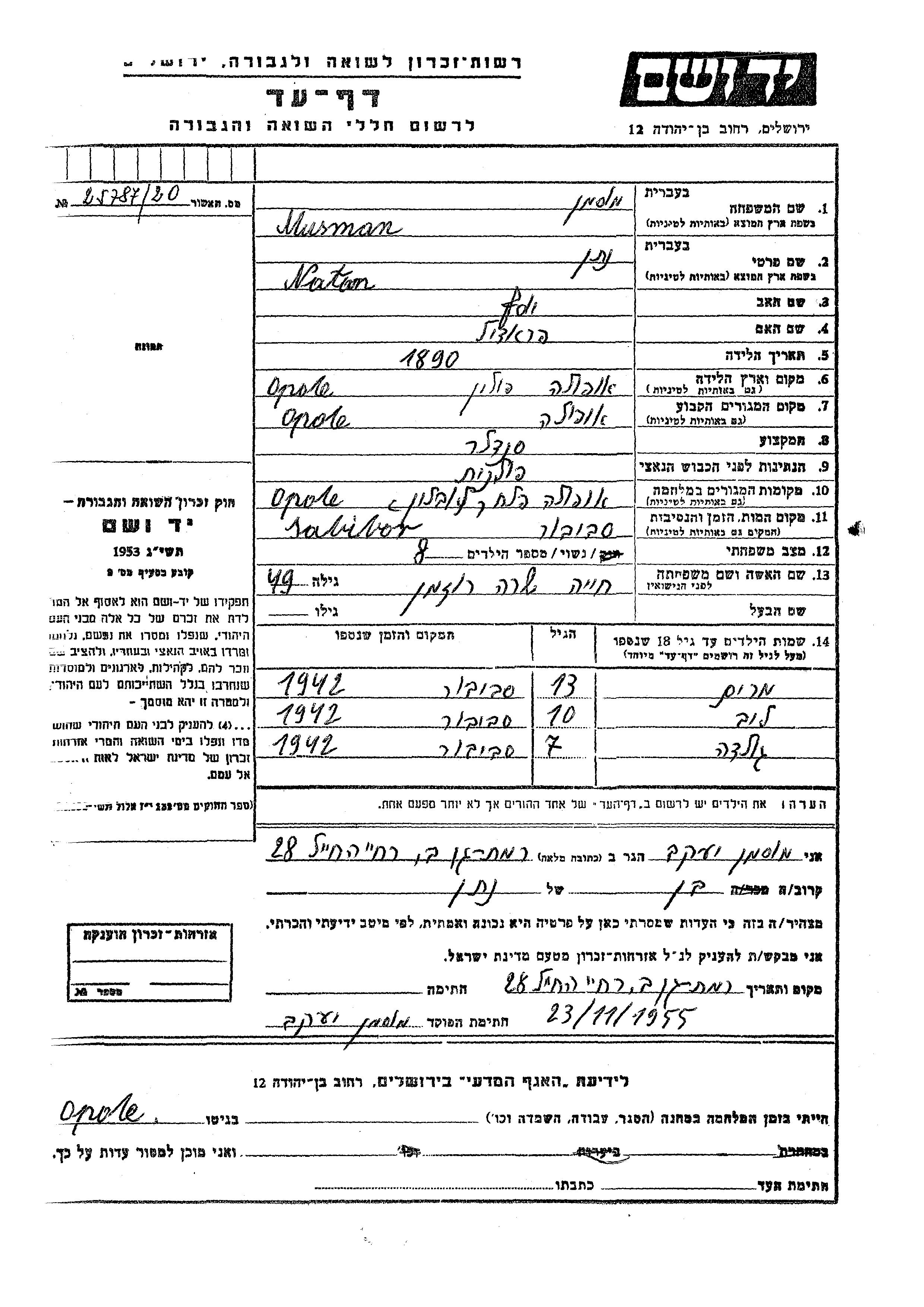 Голда Мусман Натан Хая Сара девичья фамилия Розман. Ребенок. Место жительства до войны: Ополе, Польша. Место во время войны: Ополе-Любельске, Польша.