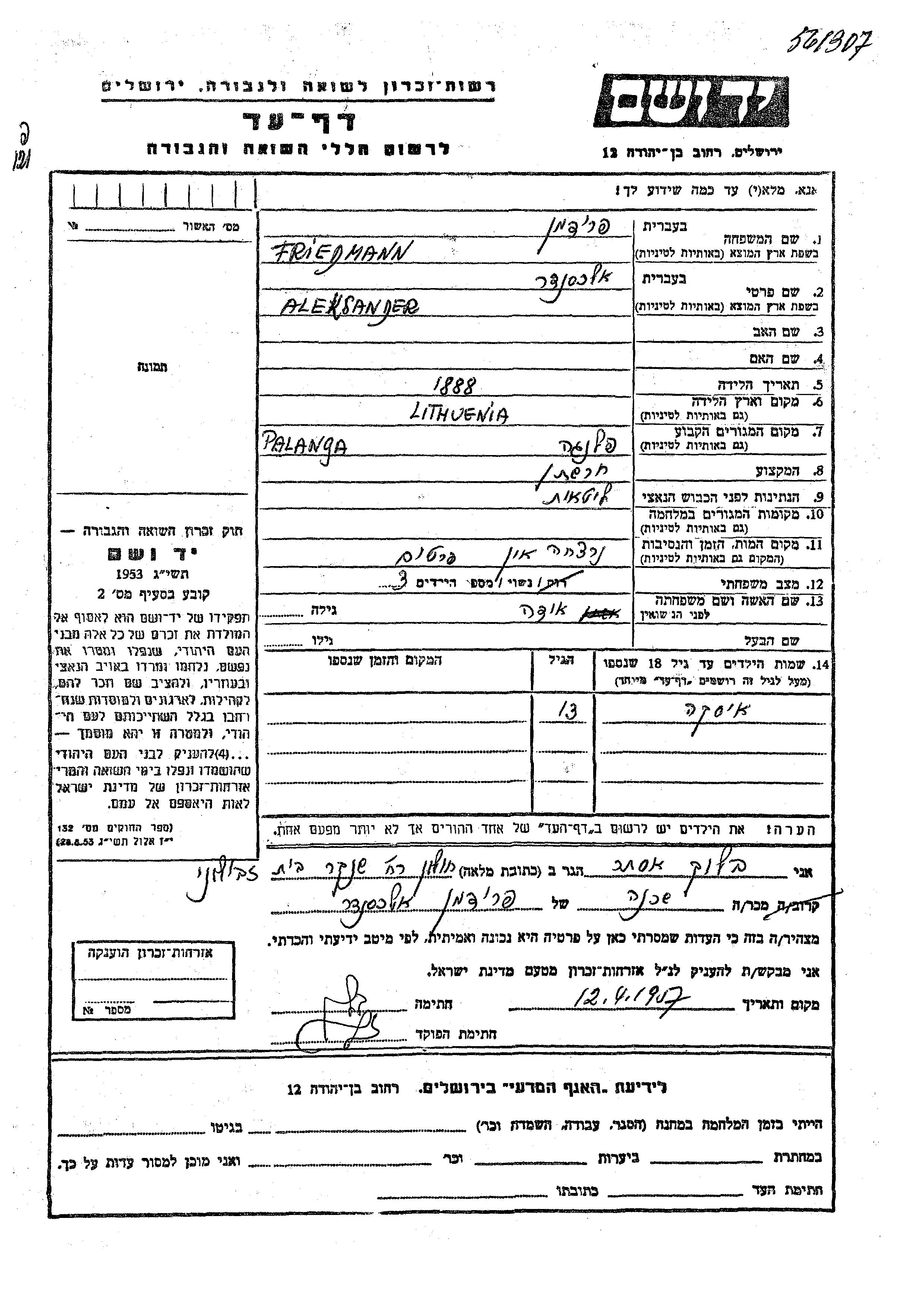 Фридманн Иска Паланга, Литва Лист свидетельских показаний