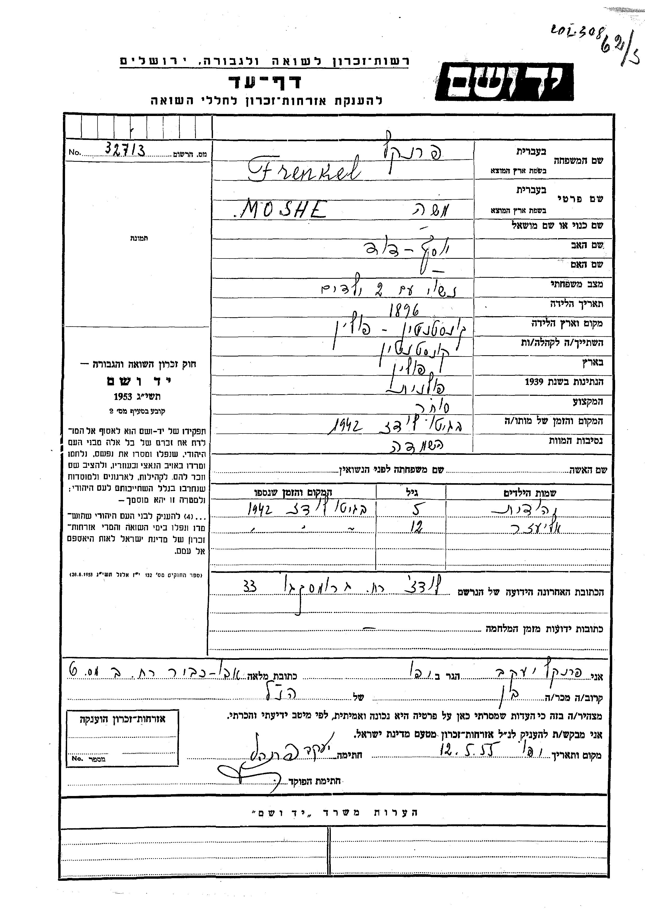 Френкель Иегудит 1937 Константынув, Польша Лист свидетельских показаний