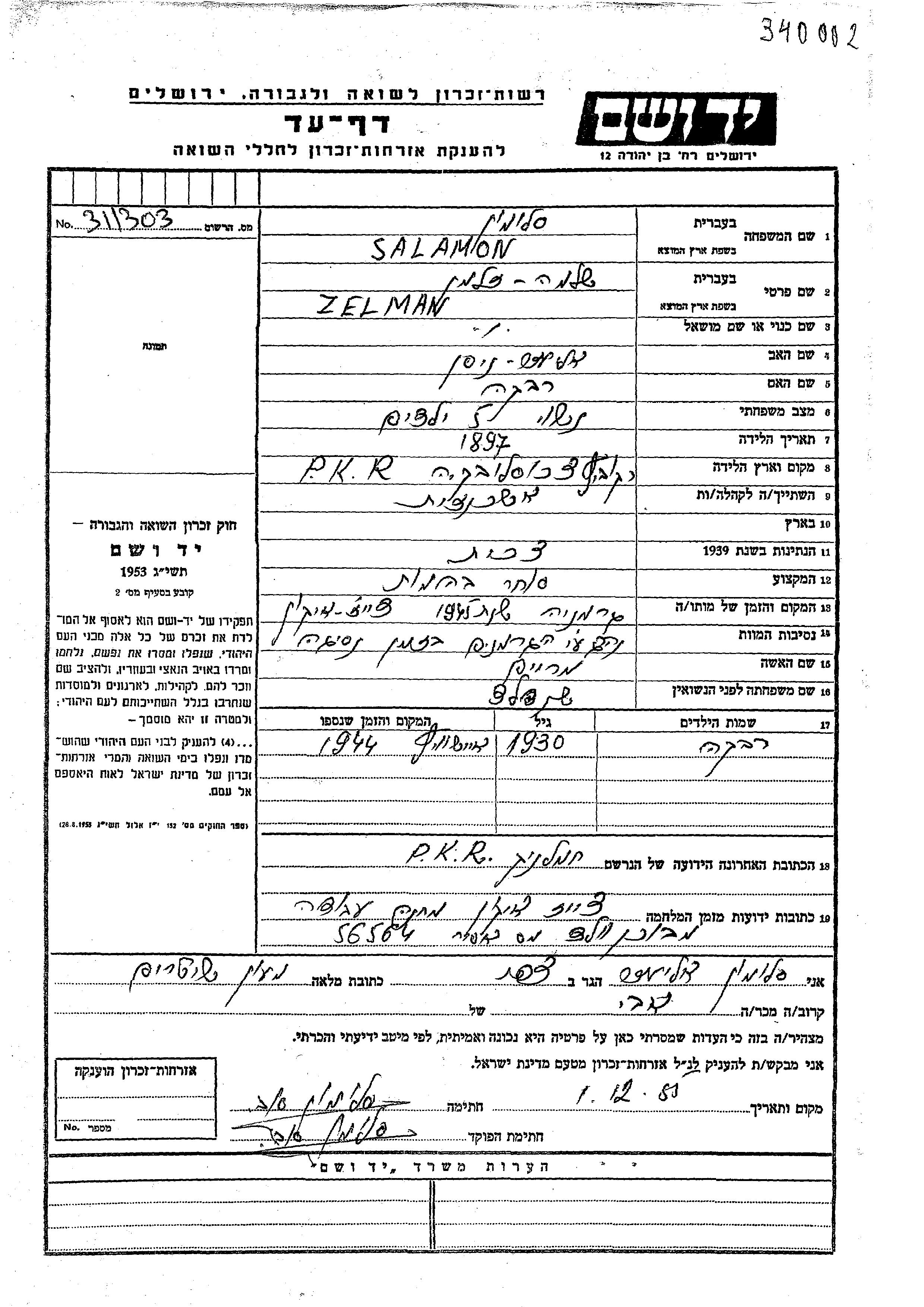 Саламон Ривка 1930 Хмельник, Чехословакия Лист свидетельских показаний