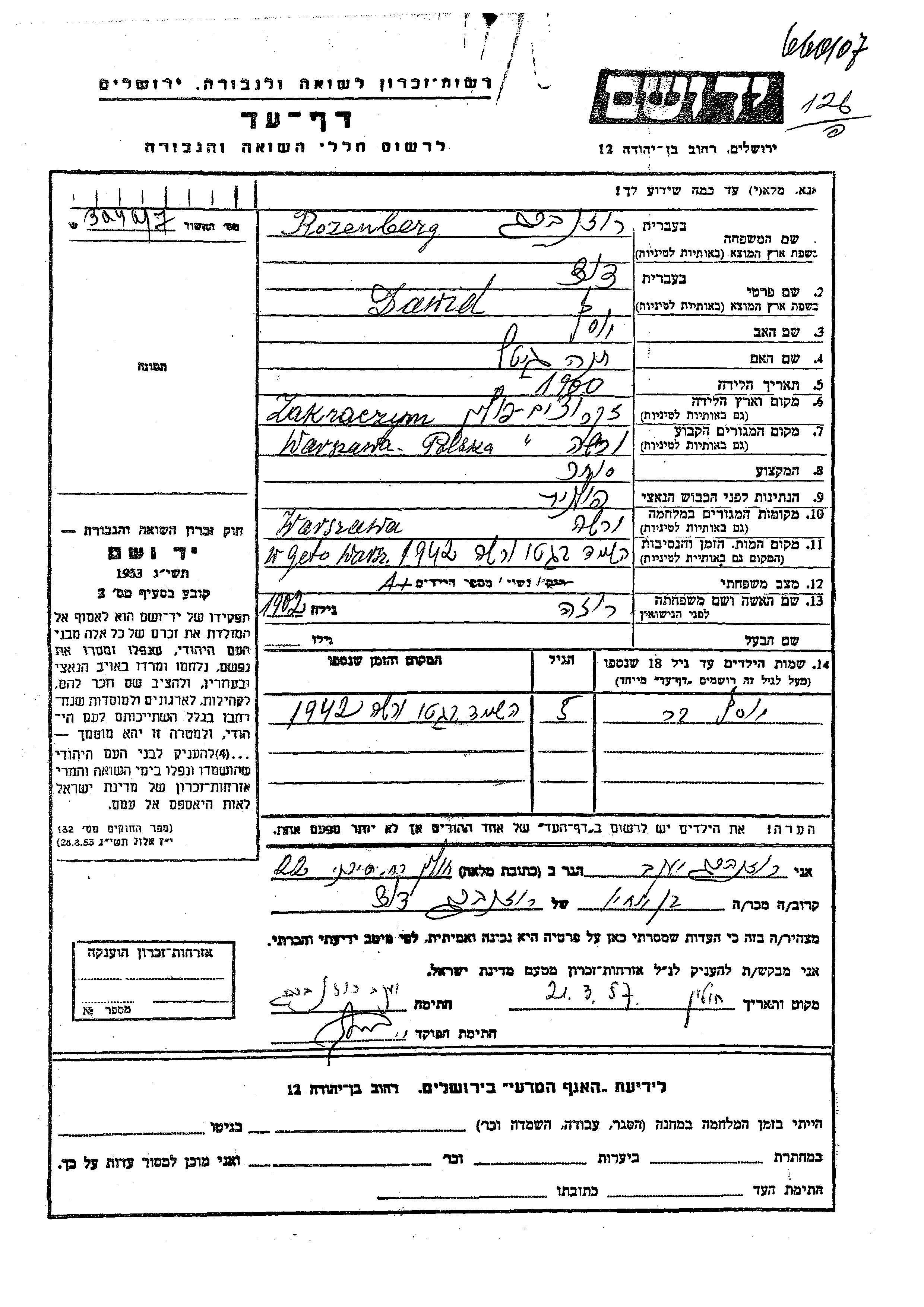 Розенберг Иосеф Бер Варшава, Польша Лист свидетельских показаний