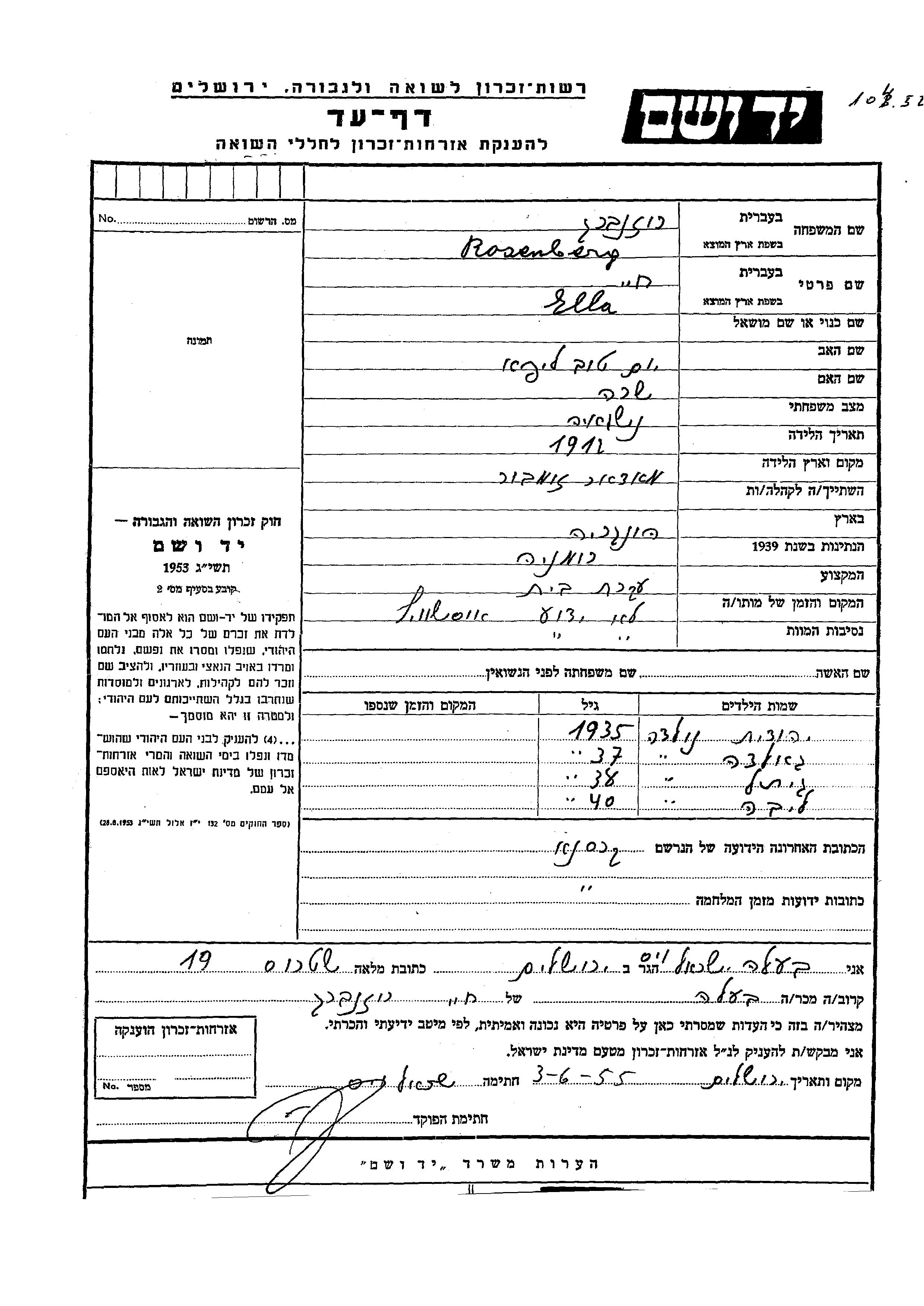 Розенберг Вейс Либа 1940 Красна, Румыния Лист свидетельских показаний