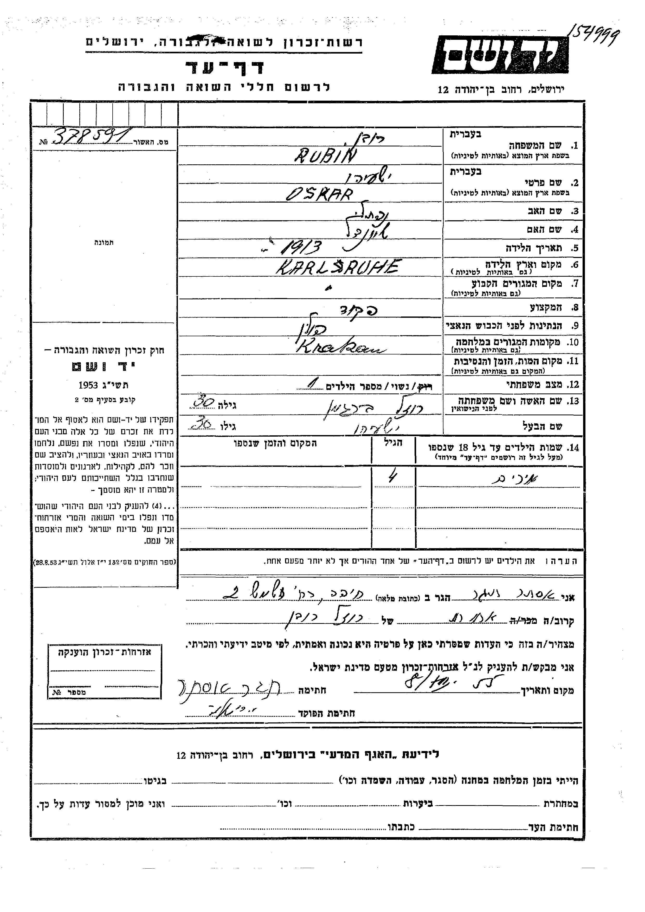 Мирьям Рубин Оскар Иешаягу Рейзел девичья фамилия Бергман. Ребенок. Место жительства до войны: Карлсруэ, Германия. Место во время войны: Краков, Польша.
