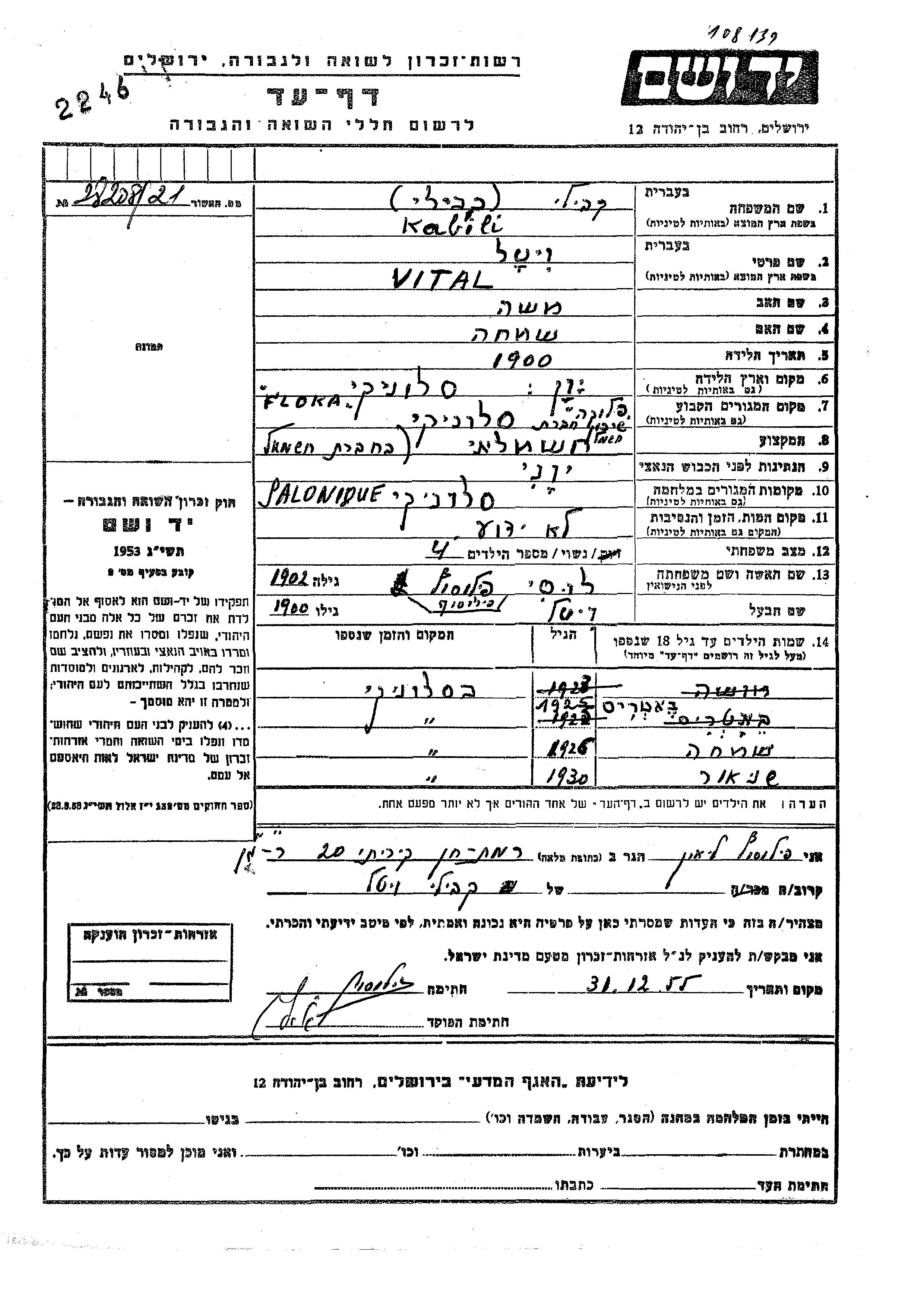 Шнеур Кабили. Отец: Виталь, mать:Люси, девичья фамилия Филозоф. Ребенок. Место жительства до войны: Салоники, Греция. Место во время войны: Салоники, Греция.