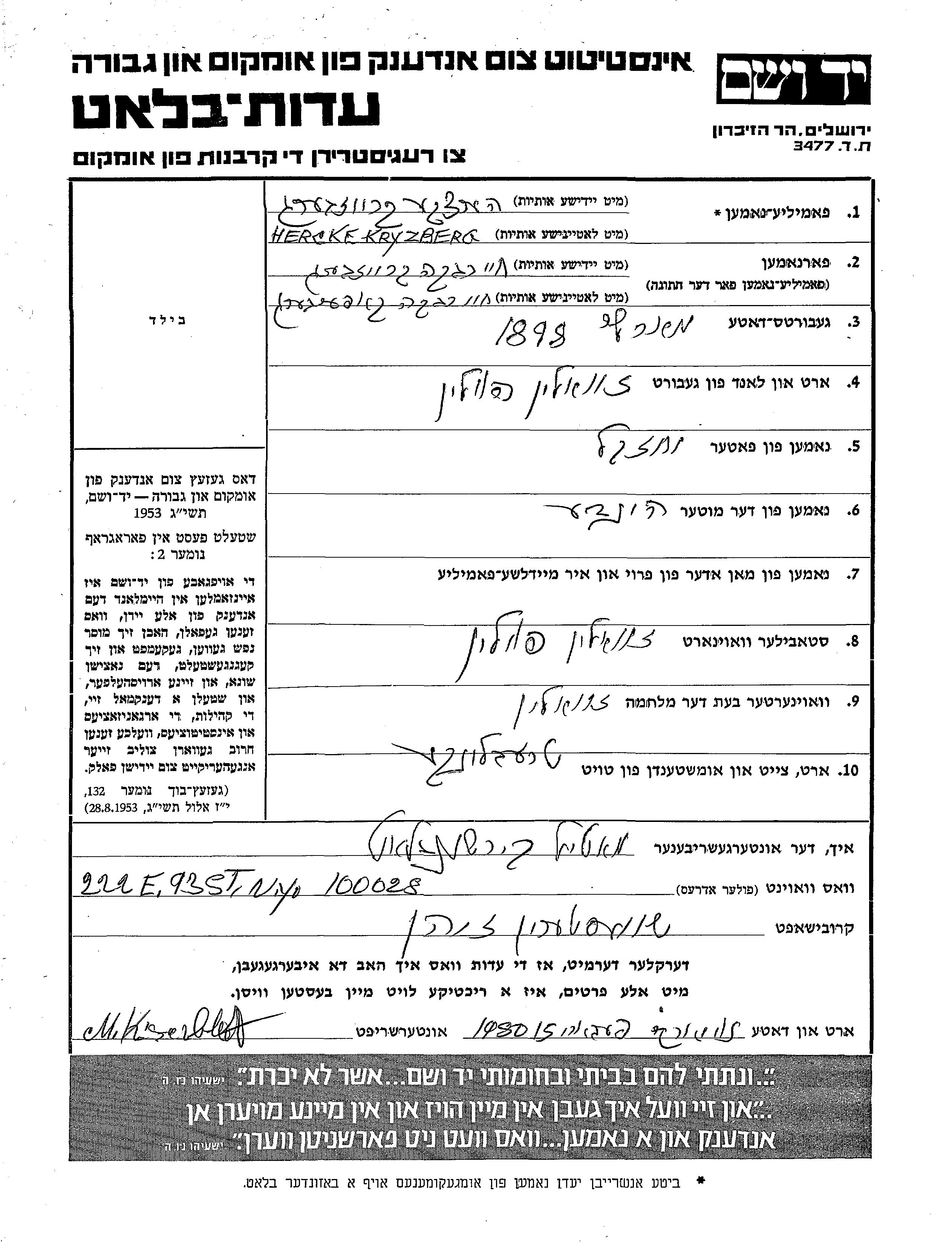 Херцке Кризберг, место рождения: Зволин, Польша. Отец: Иехезкель, mать:Хинде. Женат / замужем. Место жительства до войны: Зволин, Польша. Место во время войны: Зволин, Польша.