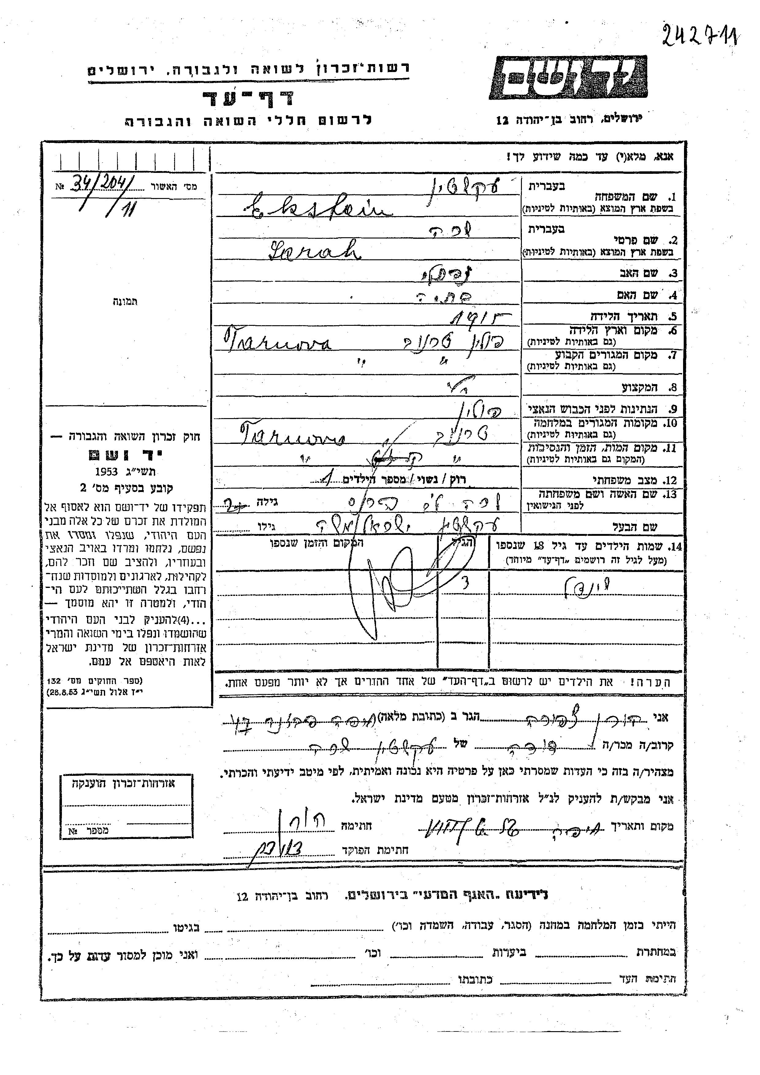 Экштайн Шейндел Тарнова, Польша Лист свидетельских показаний