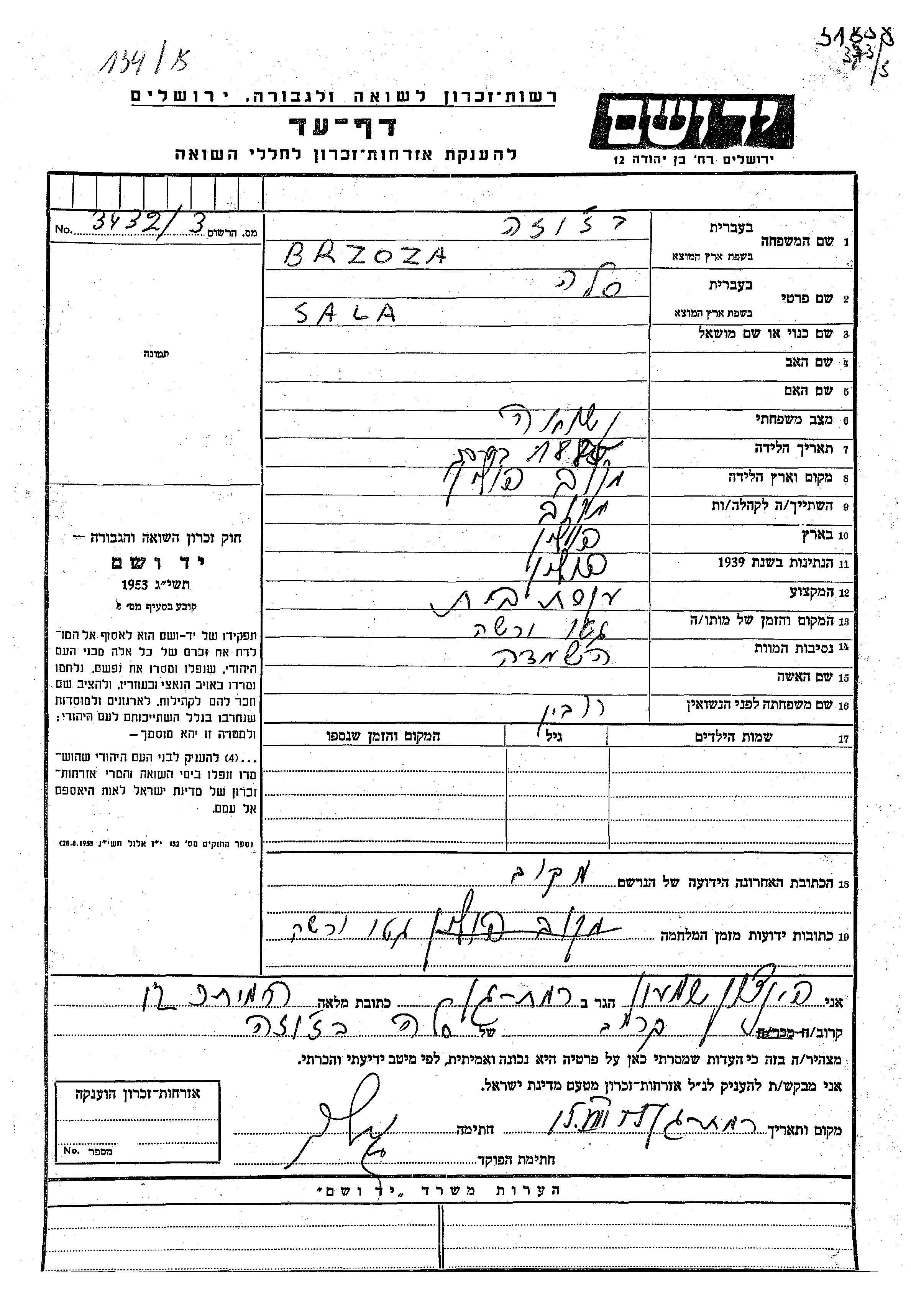 Сала Бжоза, девичья фамилия Рубин, место рождения: Макув, Польша. Домохозяйка. Женат / замужем. Место жительства до войны: Польша. Место во время войны: Польша.