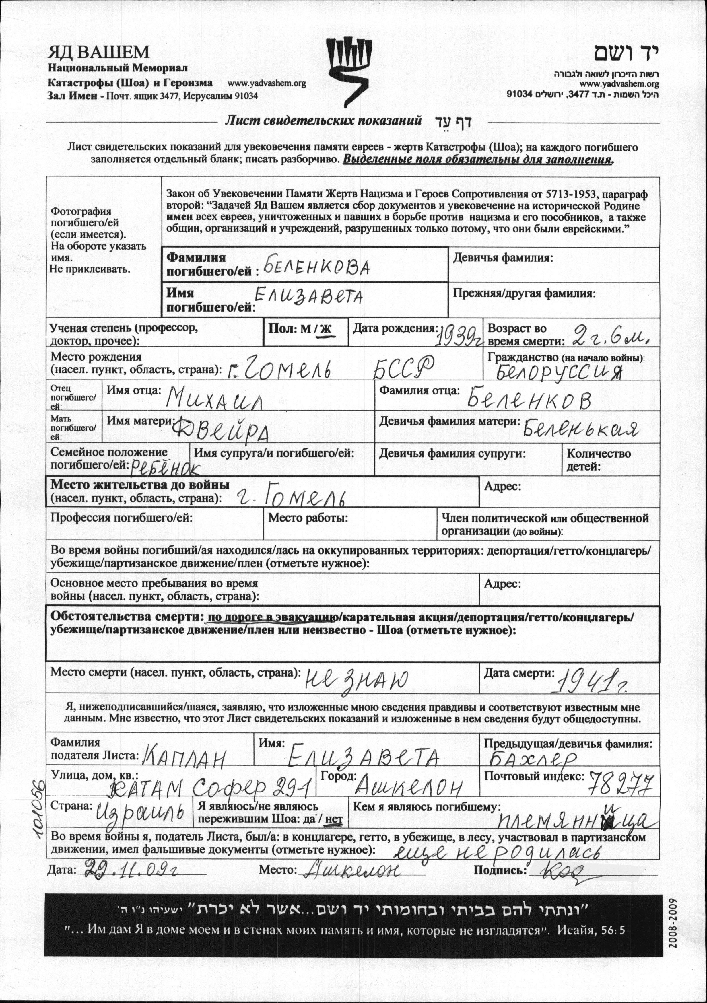 Беленкова Елизавета 1939 Гомель, Белоруссия (СССР) Лист свидетельских показаний