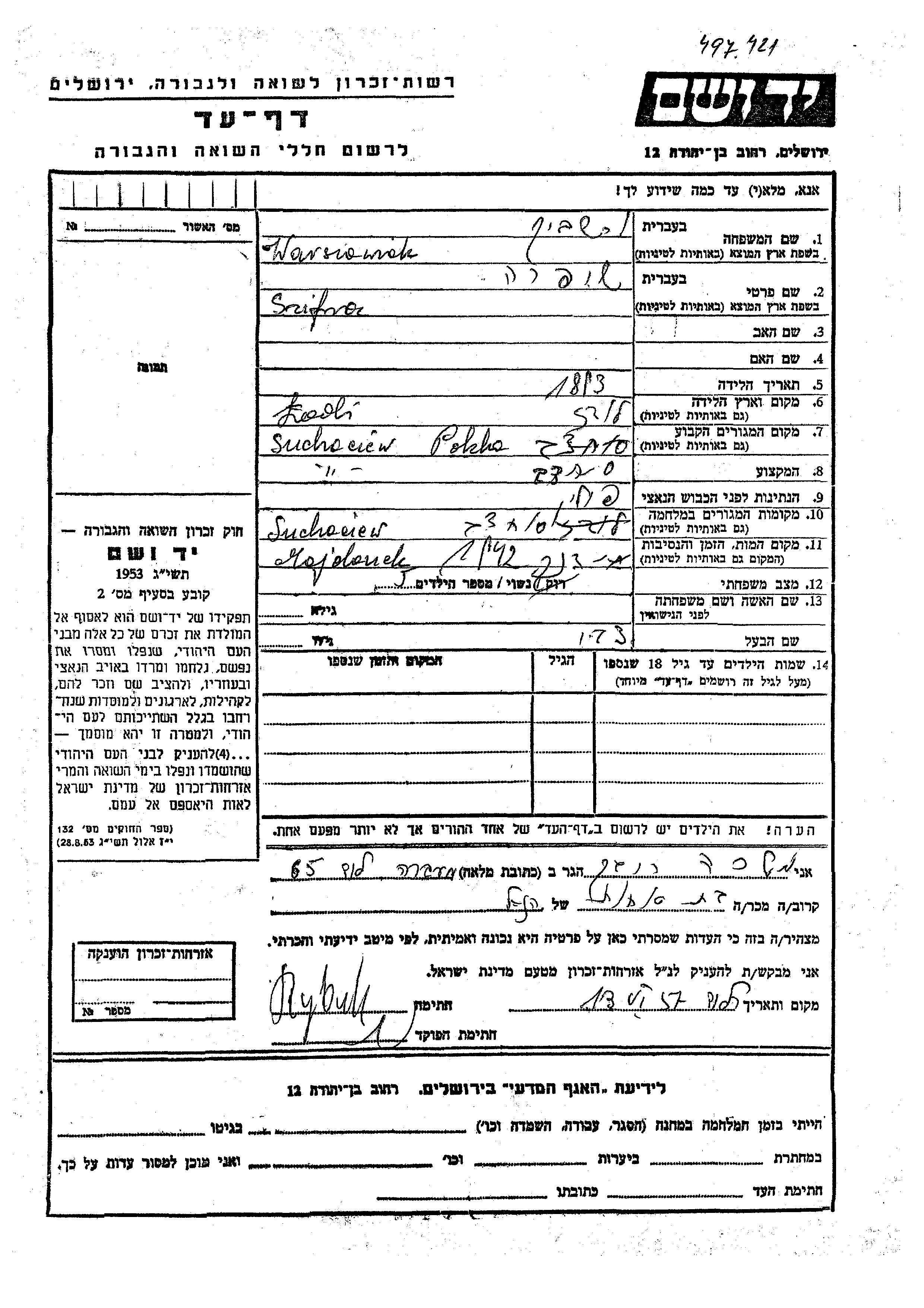 Шифра Варшавяк, место рождения: Лодзь, Польша. Женат / замужем. Место жительства до войны: Сохачев, Польша. Место во время войны: Сохачев, Польша.