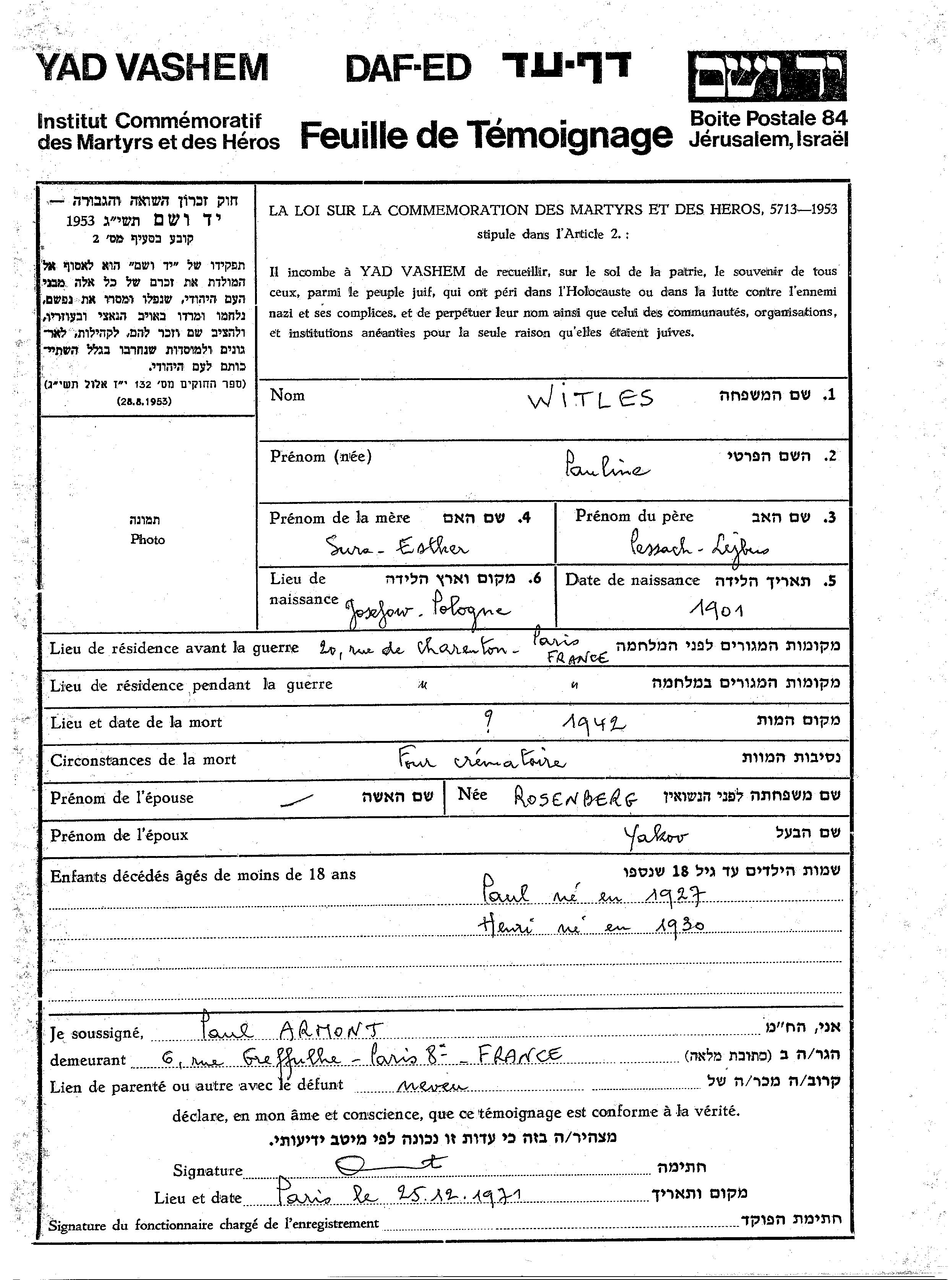 Пауль Витлес. Отец: Яков, mать:Паулине, девичья фамилия Розенберг. Ребенок. Место жительства до войны: Париж, Франция. Место во время войны: Париж, Франция.