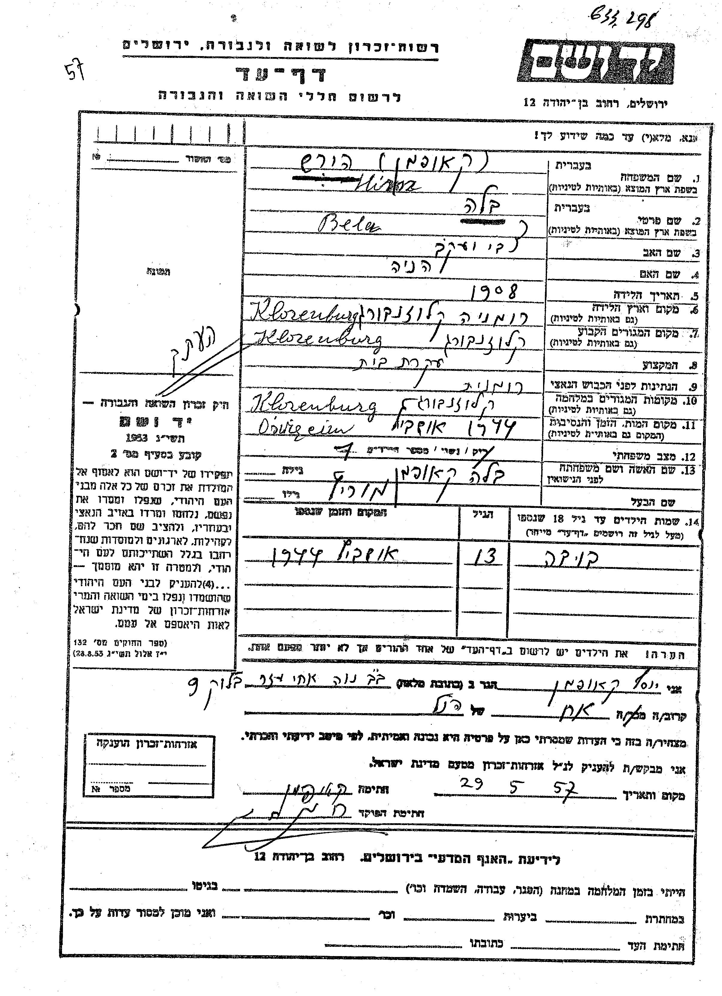 Боба Хирш Мориц Бела девичья фамилия Кауфман. Ребенок. Место жительства до войны: Клозенбург, Румыния. Место во время войны: Клозенбург, Румыния.