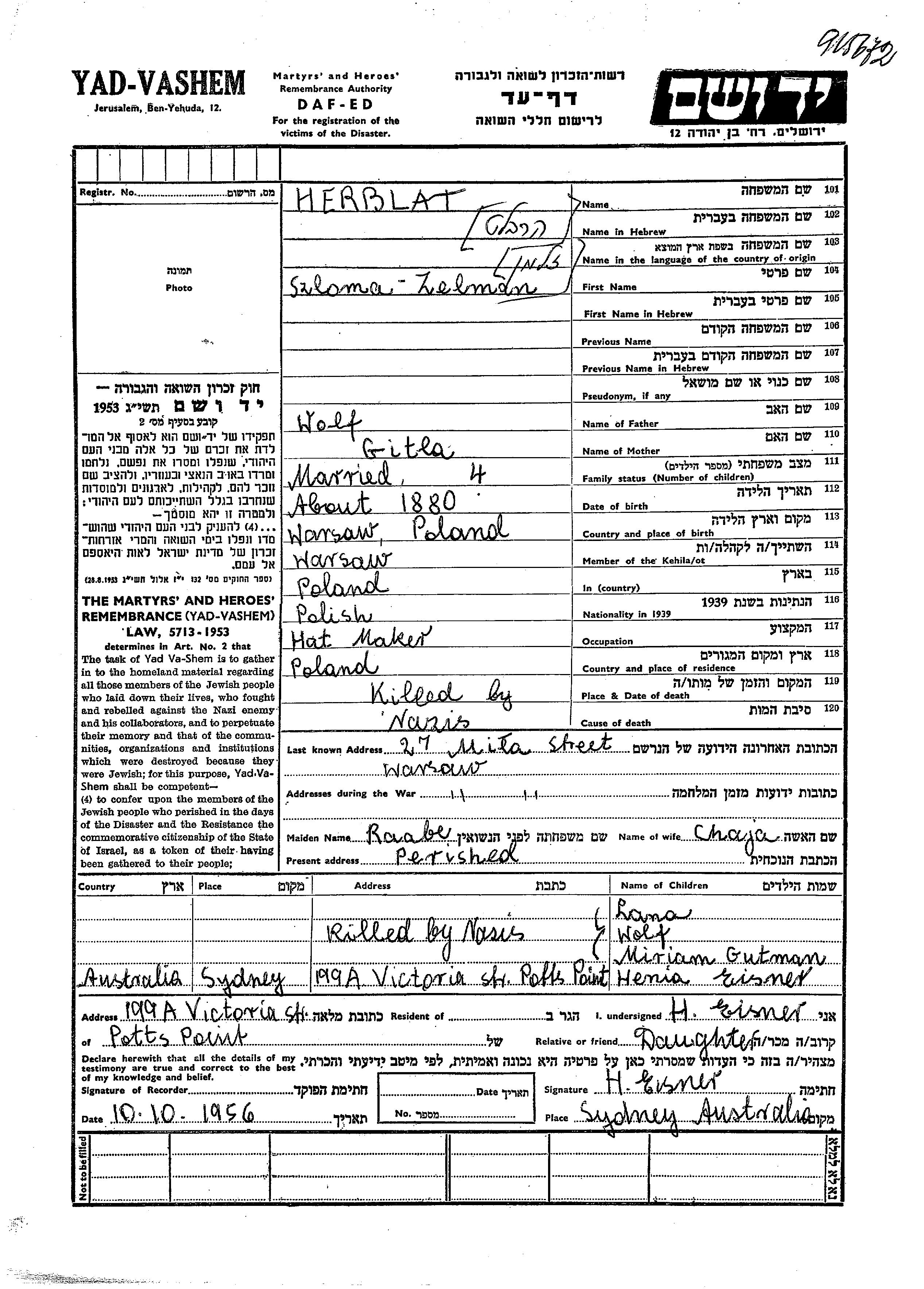 Херблат Вольф Варшава, Польша Лист свидетельских показаний