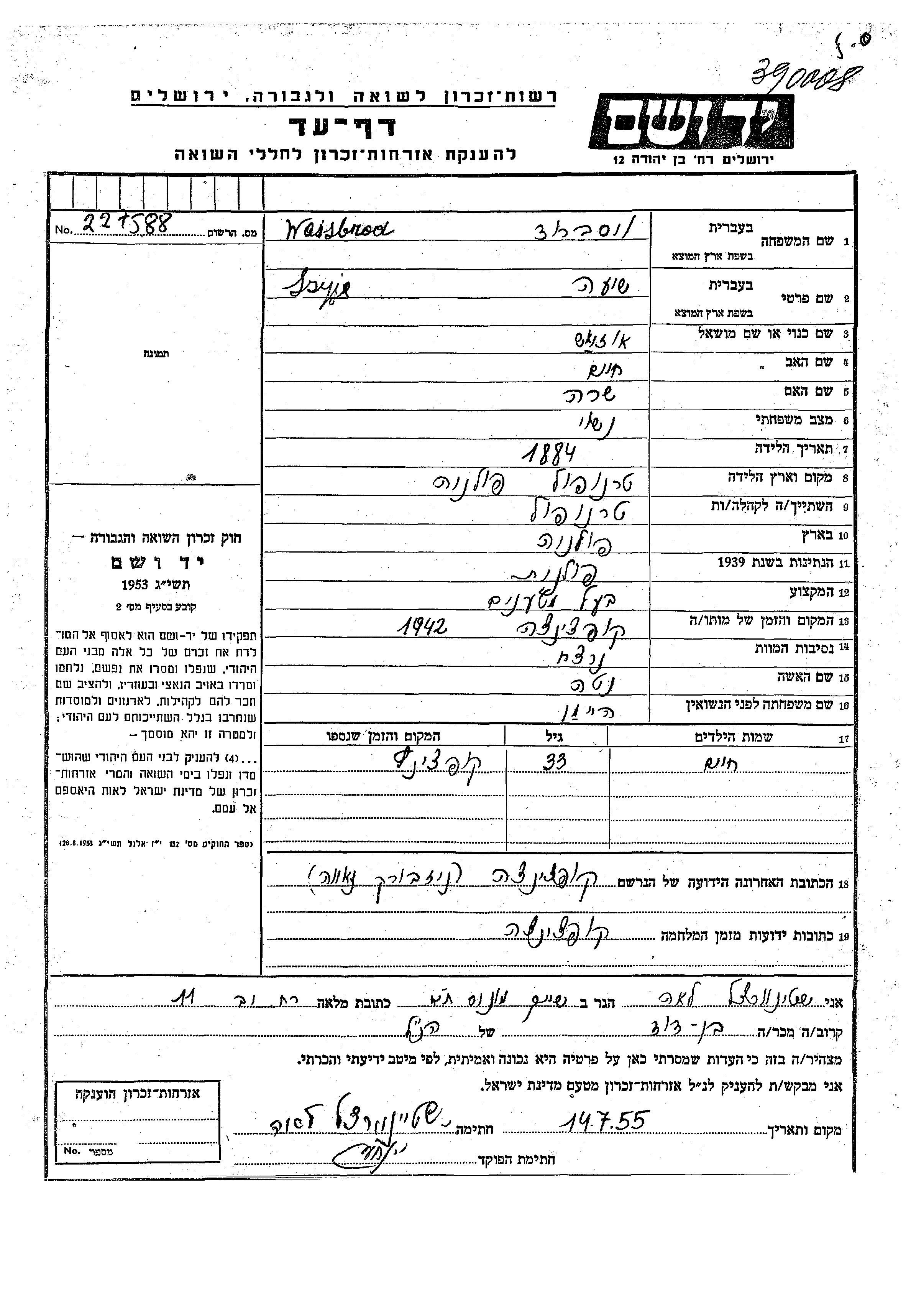 Хаим Вайсброд Шия Озияш Нета девичья фамилия Хейман. Место жительства до войны: Тарнополь, Польша. Место во время войны: Купчинце, Польша.