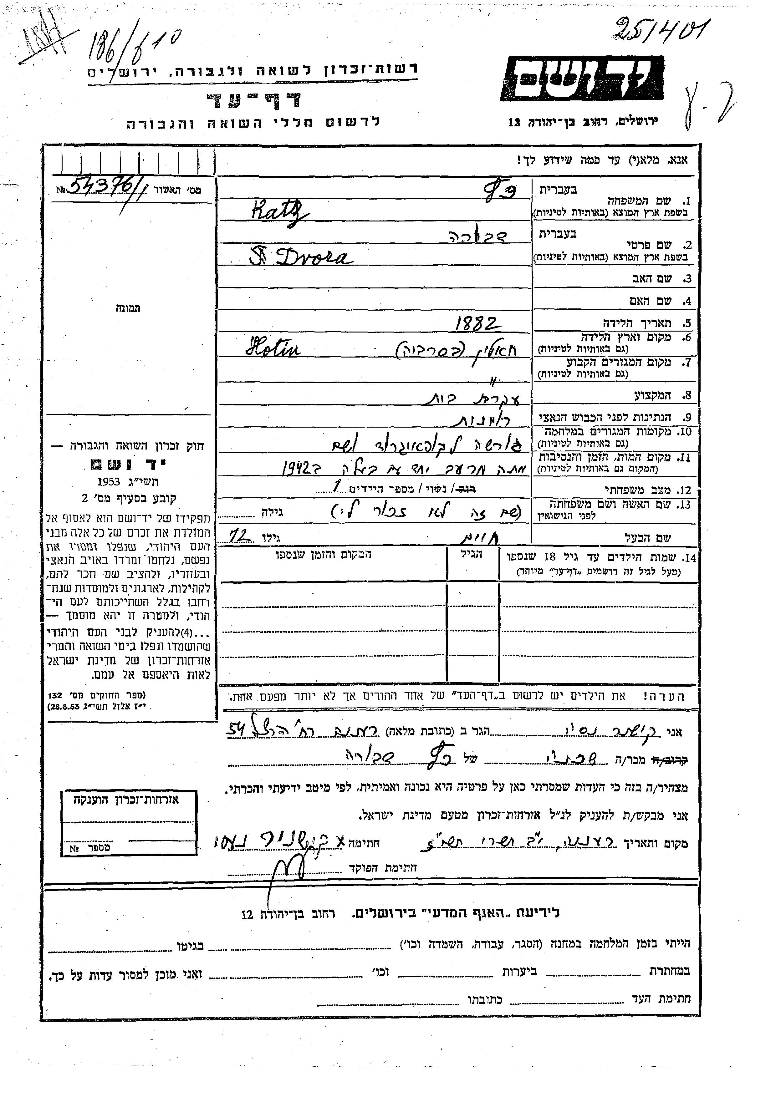 Кац Двора 1882 Хотин, Румыния Лист свидетельских показаний