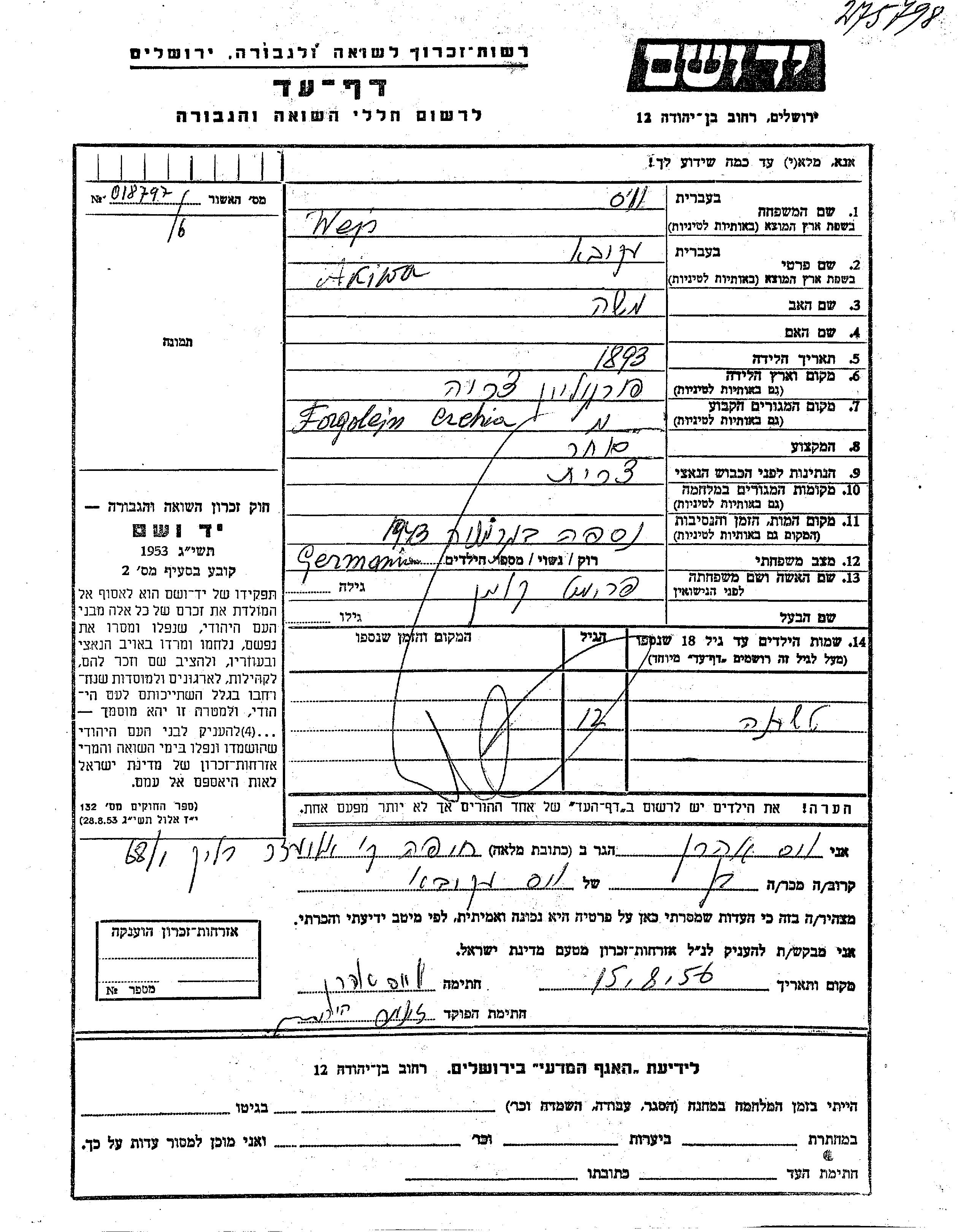 Яд Вашем - Листы свидетельских показаний Мемориального фонда