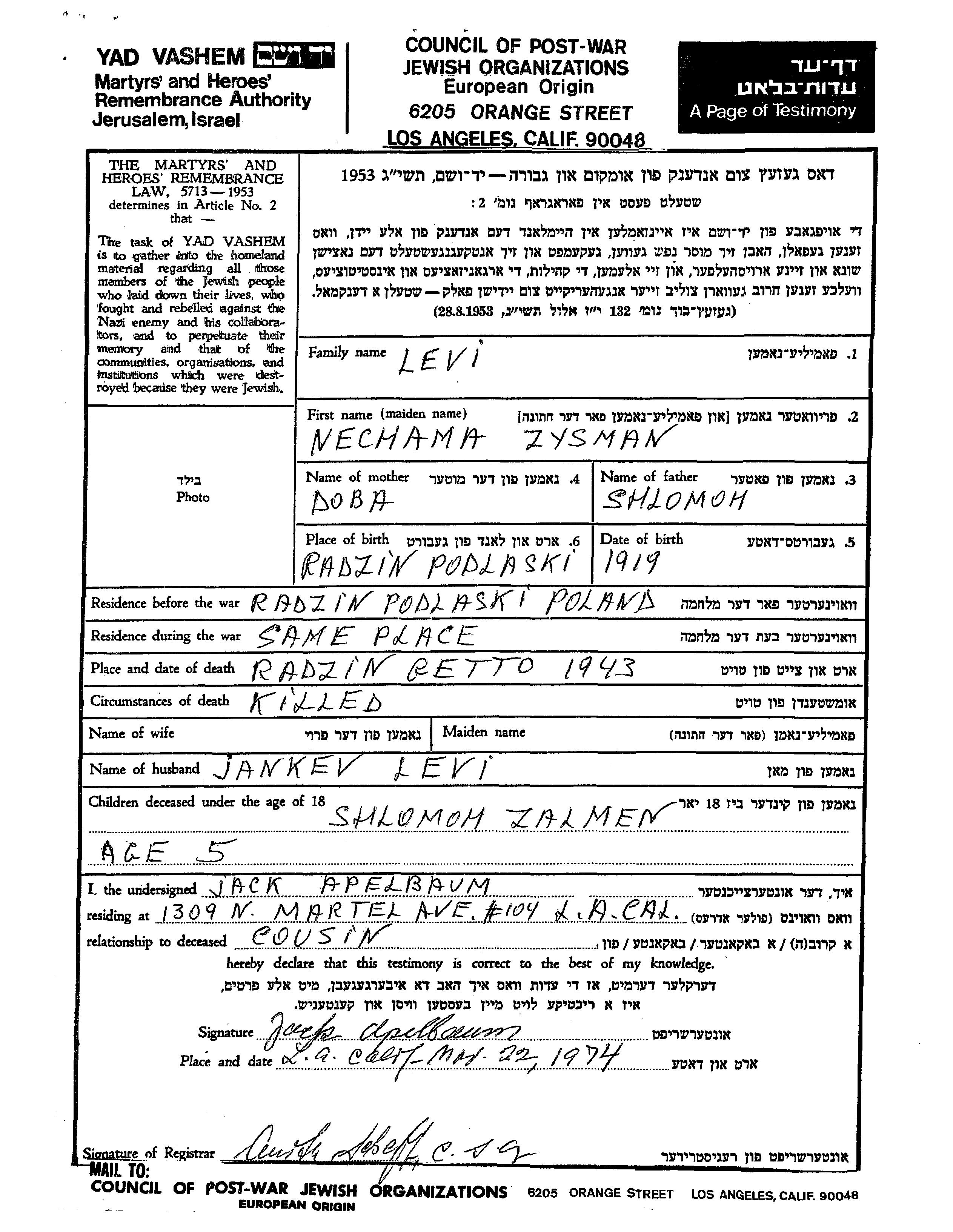 Шломо Залмен Леви Янкев Нехама девичья фамилия Зысман. Ребенок. Место жительства до войны: Радзин, Польша. Место во время войны: Радзин, Польша.