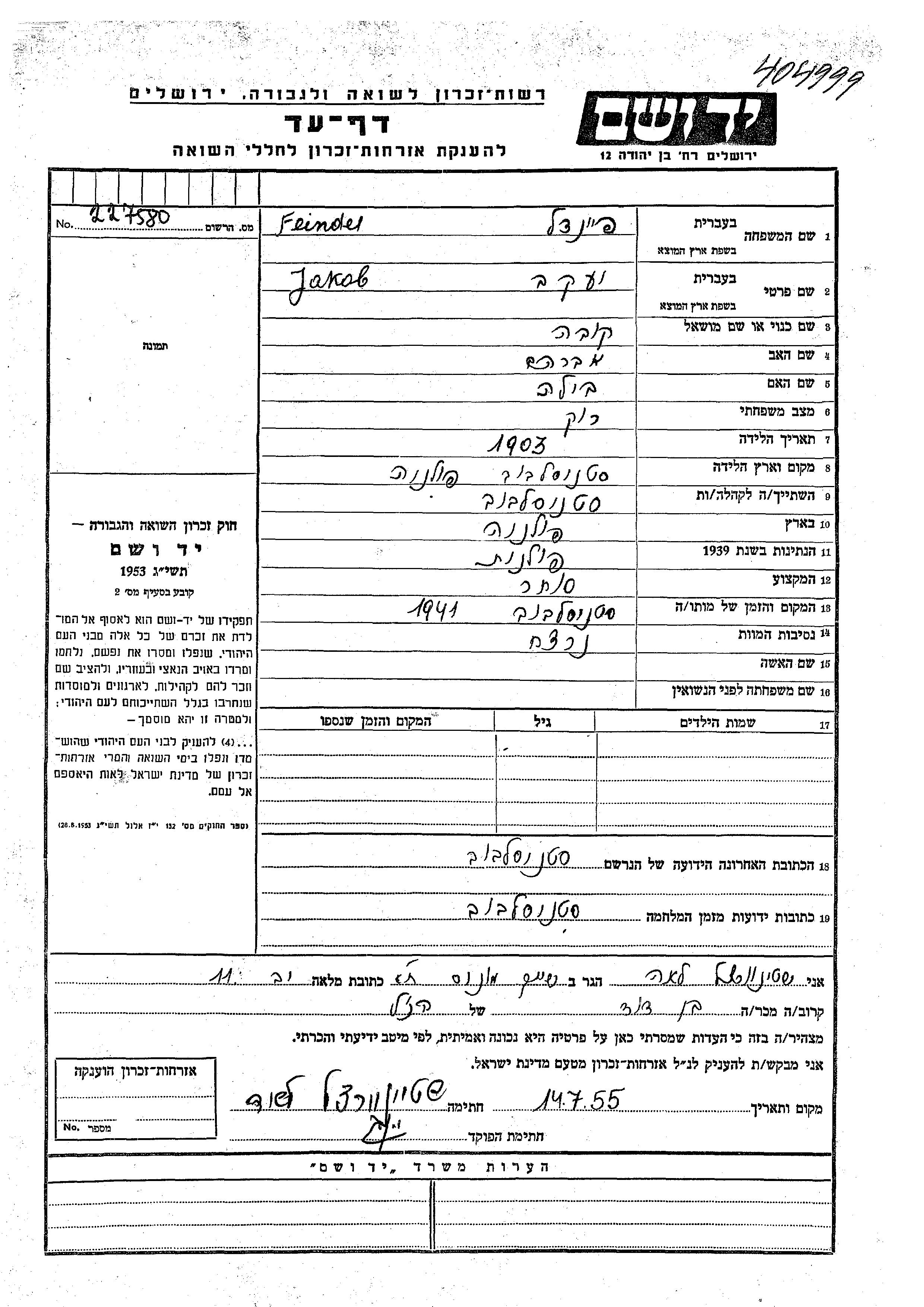 Якоб Фейндель, место рождения: Станиславув, Польша. Отец: Авраам, mать:Била. Торговец / торговка. Место жительства до войны: Станиславув, Польша. Место во время войны: Станиславув, Польша.