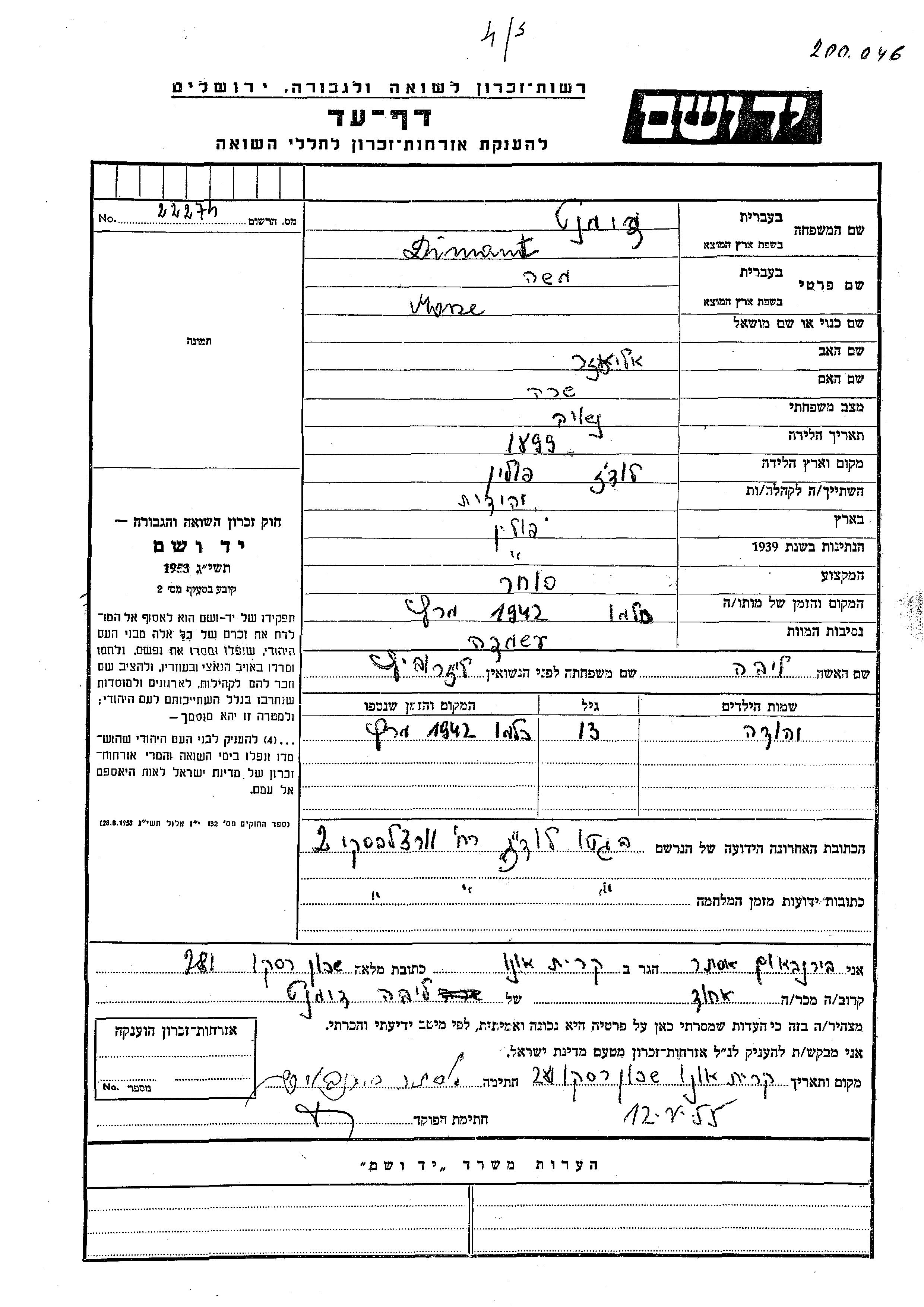 Иегуда Димант. Отец: Моше, mать:Либа, девичья фамилия Лазаровиц. Ребенок. Место жительства до войны: Польша. Место во время войны: Лодзь, Польша.