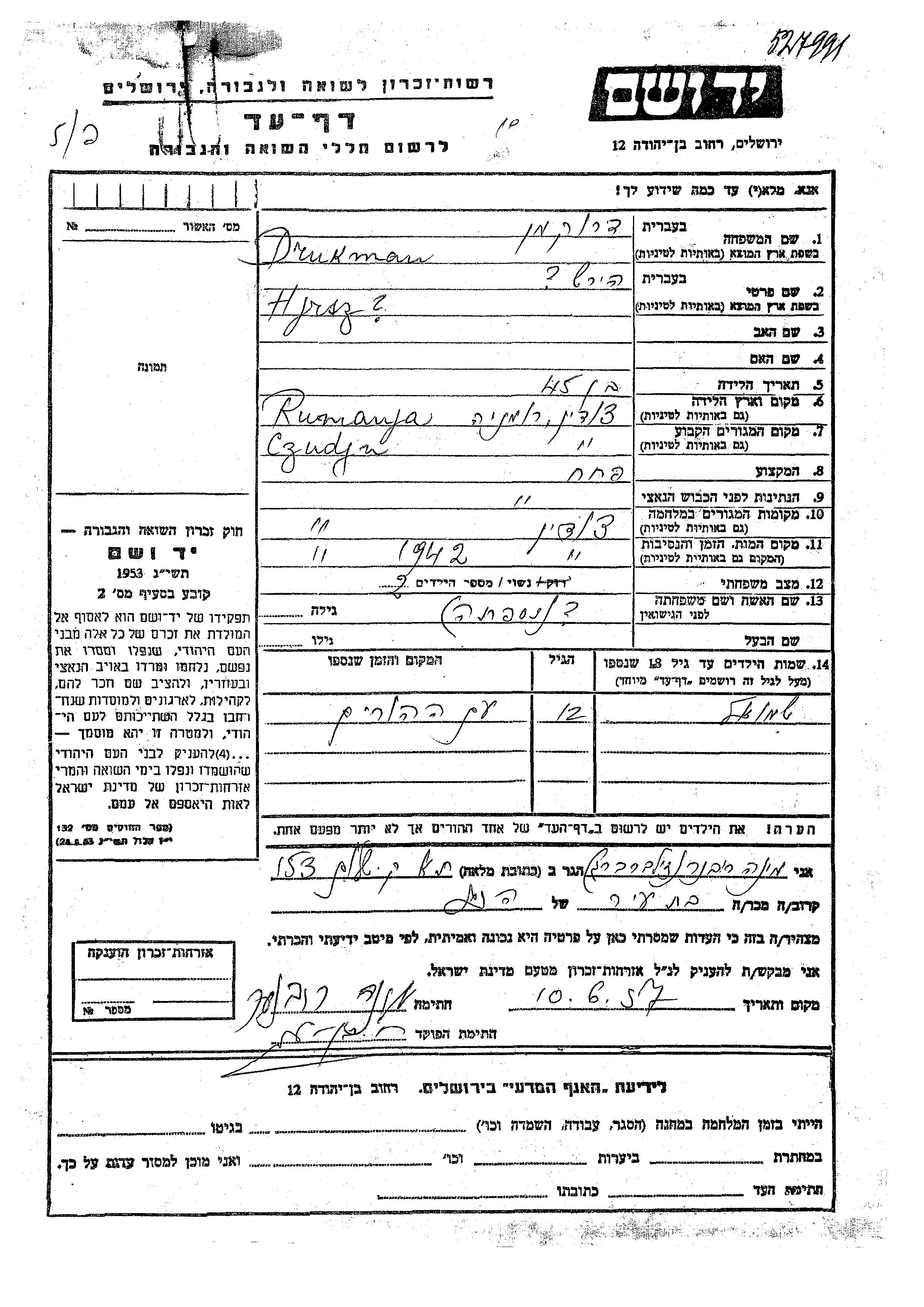 Друкман Шмуэль Чудин, Румыния Лист свидетельских показаний